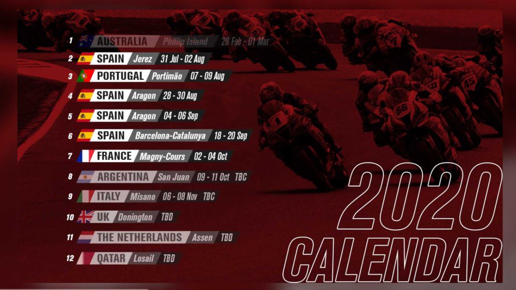 2020年6月, 新的MotoGP日歷得到確認(rèn)的消息傳出后,賽車迷們有了更多的好消息。WSBK也剛剛宣布了其修訂的2020賽季日歷。2020年MOTUL FIM超級摩托車世界錦標(biāo)賽,在與各國政府,國際摩托車運(yùn)動(dòng)聯(lián)合會(huì)(FIM),巡回賽,圍場人員和Dorna WSBK組織(DWO)進(jìn)行討論之后,確定了2020年剩余時(shí)間的臨時(shí)日歷。