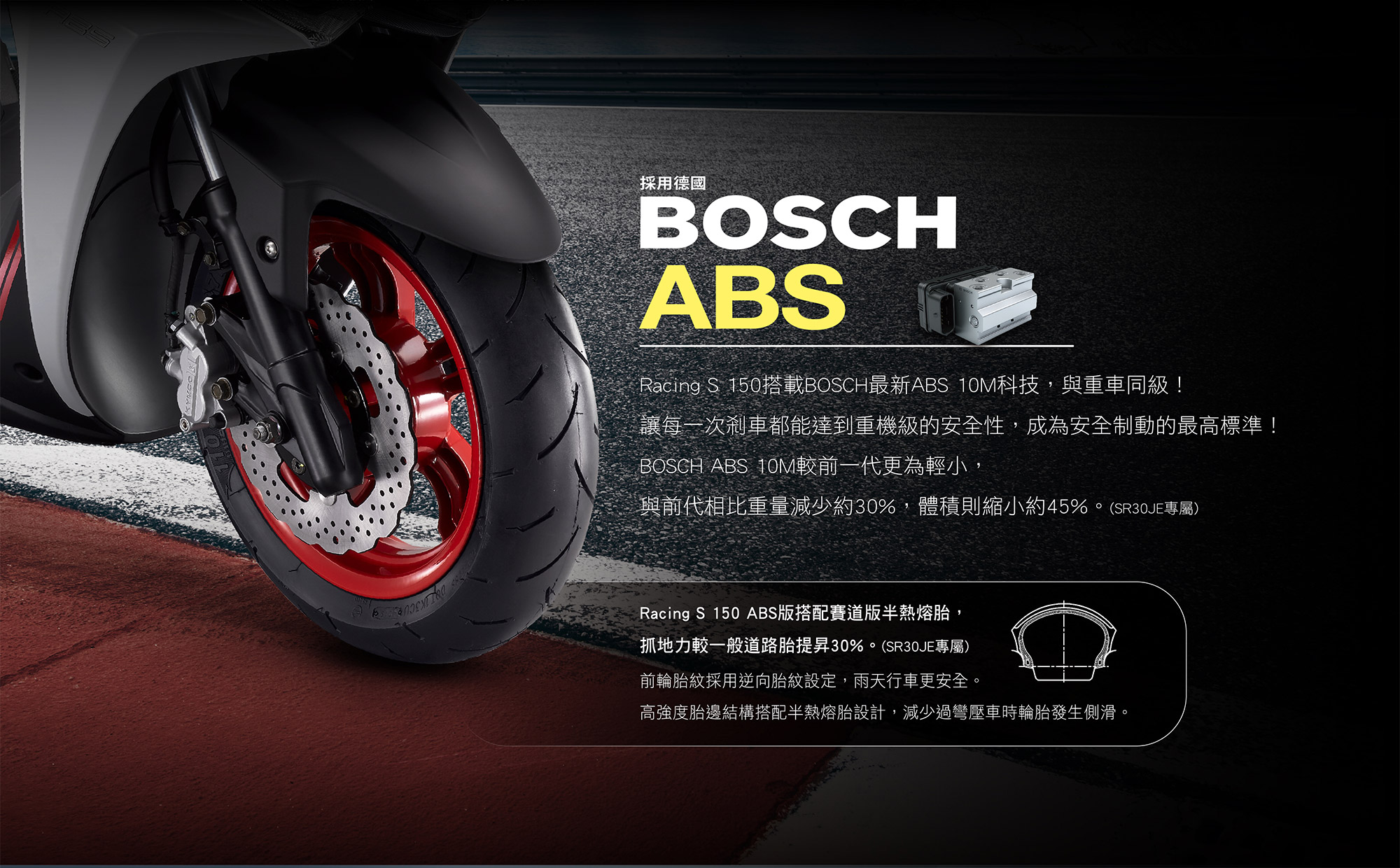 首先,150cc級別的踏板配備半熱熔胎,這個很少見。前剎采用前雙活塞卡鉗與240mm浮動碟,搭配最新的BOSCH ABS 10M,這個配置在150cc踏板這個級別里面基本上已經(jīng)難逢敵手!