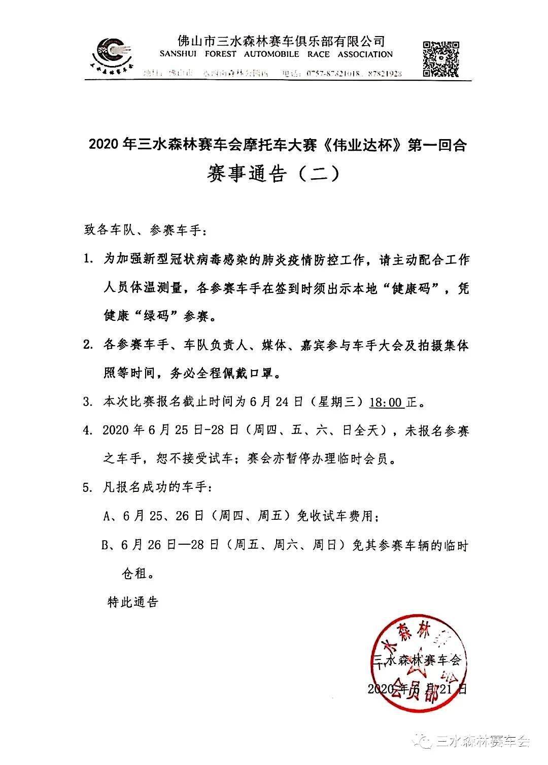 三水森林賽車會(huì)摩托車大賽 偉業(yè)達(dá)杯,2020 年度第一回合的比賽,將于本周日(六月 27 - 28 日)舉行。