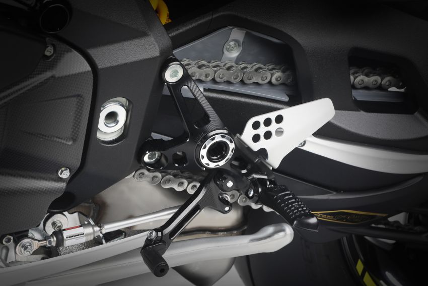 制動方面是通過Brembo Stylema四活塞卡鉗來完成的,前制動鉗用Brembo徑向主缸搭配320mm直徑的雙浮動浮盤,后制動是帶有Brembo兩活塞卡鉗的220毫米制動盤,前后制動均由Bosch 9 Plus ABS控制,并帶有后輪防舉升裝置。