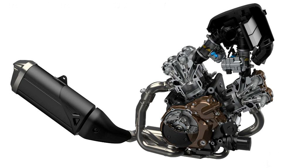 雖然新款車型的發(fā)動(dòng)機(jī)排量、缸徑和行程都沒有變動(dòng),但SCEM發(fā)動(dòng)機(jī)活塞和DOHC凸輪軸都更換了,壓縮比由11.3上升至11.5:1。節(jié)氣閥囗徑由45mm上升至49mm,供油份量也多了,所以V-Storm 1050增加了馬力輸出是必然的。新款車型發(fā)動(dòng)機(jī)的最大功率為78kW (106hp)/ 8,500rpm,最大扭矩為99Nm/ 6,000rpm。