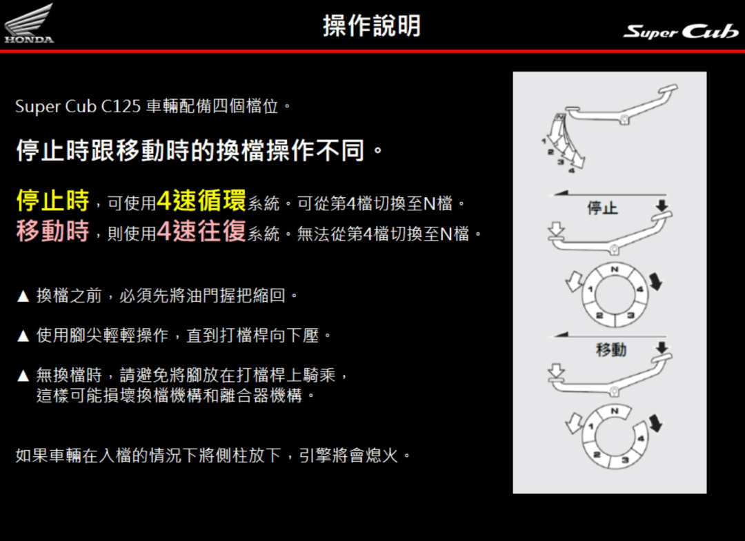 或許大家對于這類型車款不太熟悉,解釋一下操作方式。簡單來說C125是一輛沒有離合器拉桿的檔車,但可不是X-ADV的DCT變速系統(tǒng)。C125采用四速檔位設定,「往前踩進檔、往后踩(勾)退檔」,行駛時該車款會是“往復檔”,但如果在靜止狀態(tài),可以直接由四檔踩入N檔,轉(zhuǎn)變?yōu)?ldquo;循環(huán)檔”邏輯。