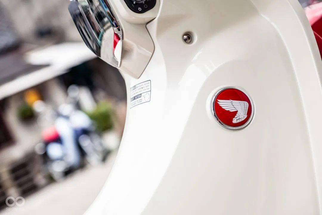 當然,因為車體設計,所以騎士的兩腿間并不是如同小綿羊車款那種完全平整的腳部空間,但低矮的龍骨設計,讓騎士即便身著裙裝,依舊可以優(yōu)雅地在路上騎乘。車上的Logo并不是現(xiàn)在的翅膀Logo,而是老HONDA限定的紅底標。