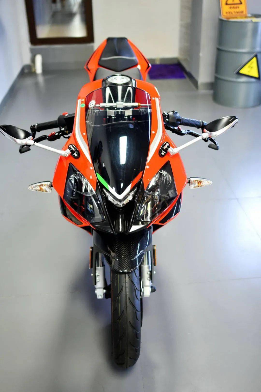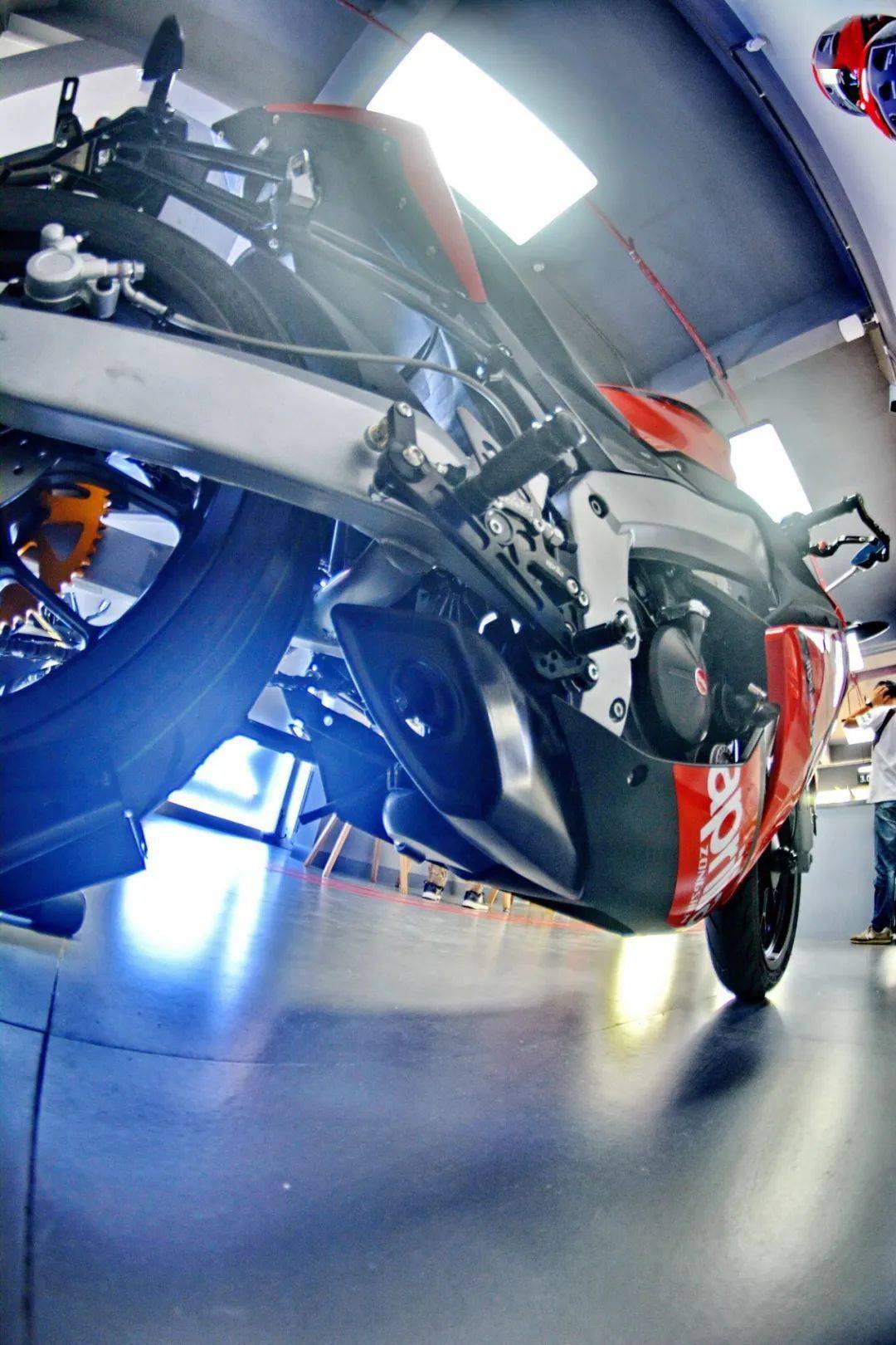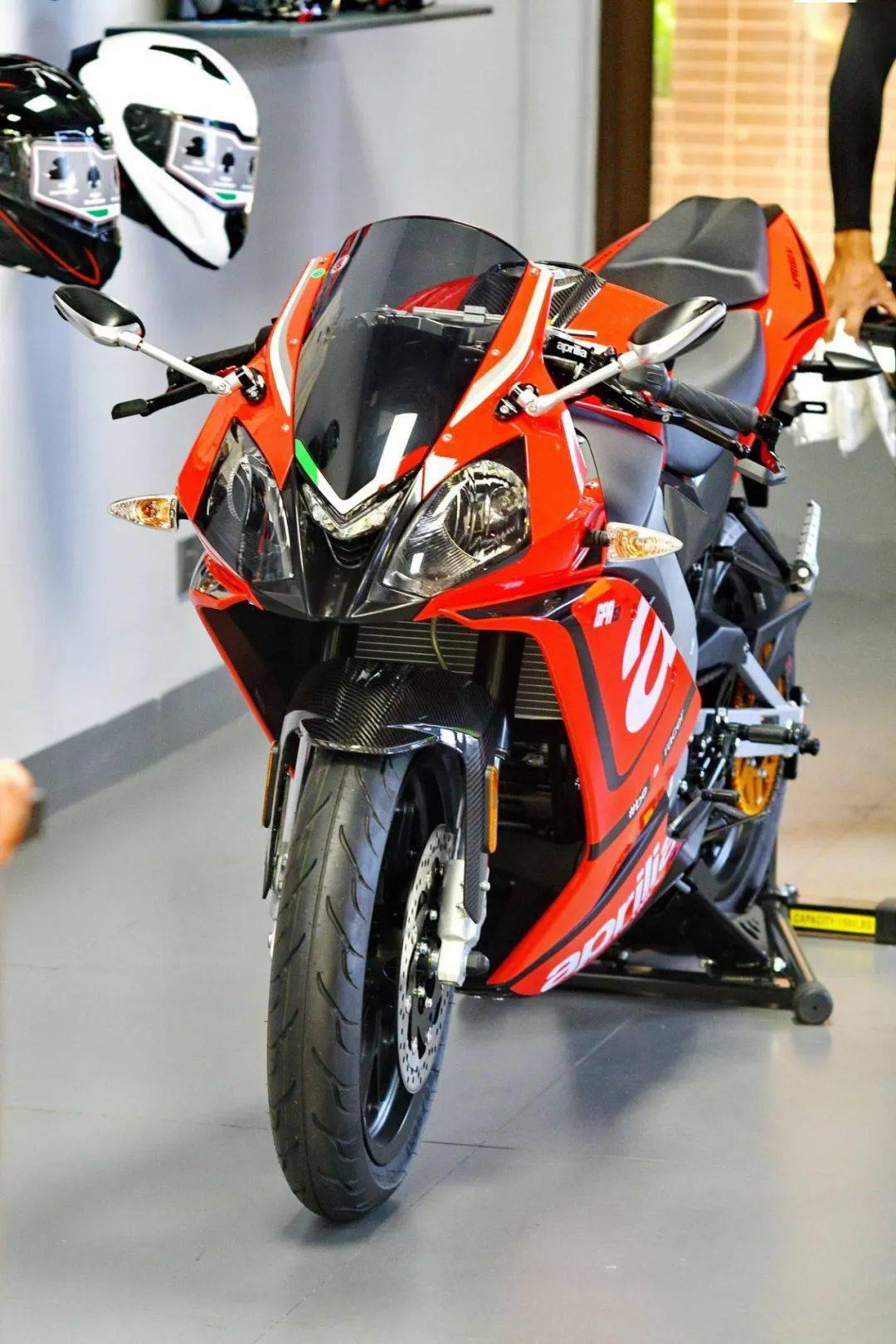 該體驗(yàn)中心內(nèi),一臺(tái)配備了競(jìng)技級(jí)原廠(帶 aprilia 標(biāo)志)改裝件的 aprilia 阿普利亞 GPR150(APR150-V)被放置在首層,與頭盔、賽車皮衣等用品一起作相互配襯。