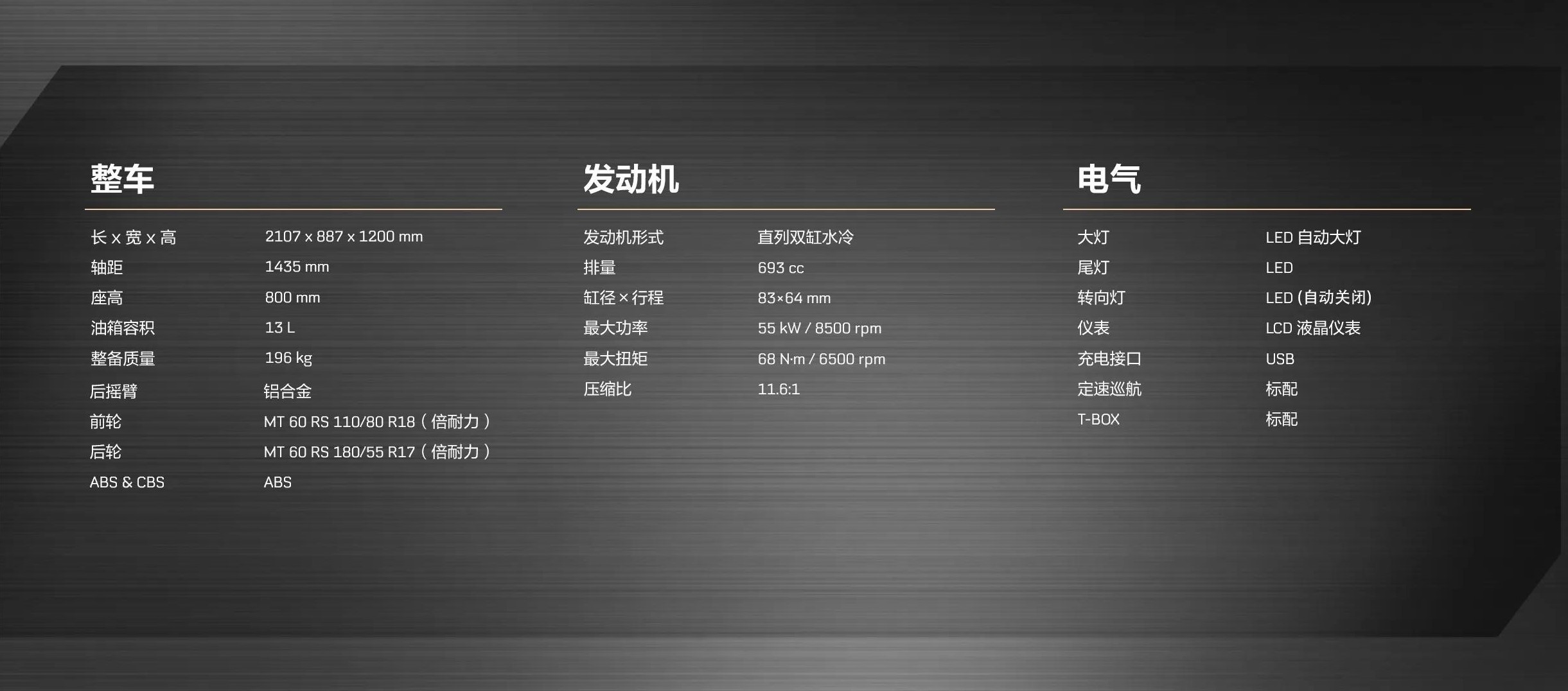 國(guó)產(chǎn)摩托車上,首款配備自動(dòng)大燈、自動(dòng)巡航功能的車型,另外電子油門(mén)的加入,也讓這臺(tái)車在各種駕駛模式之間的切換如魚(yú)得水。全段可調(diào)的KYB前后減震達(dá)到了同級(jí)最高的水平;制動(dòng)方面同樣是高規(guī)格,前剎車為西互對(duì)向四活塞卡鉗+320mm浮動(dòng)盤(pán),后剎車為260mm單盤(pán)+西互雙活塞卡鉗;滑動(dòng)離合、全液晶儀表、T-BOX車機(jī)互聯(lián)、雙通道德國(guó)大陸ABS等等。