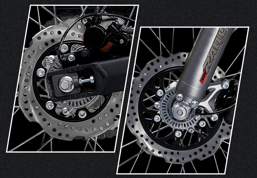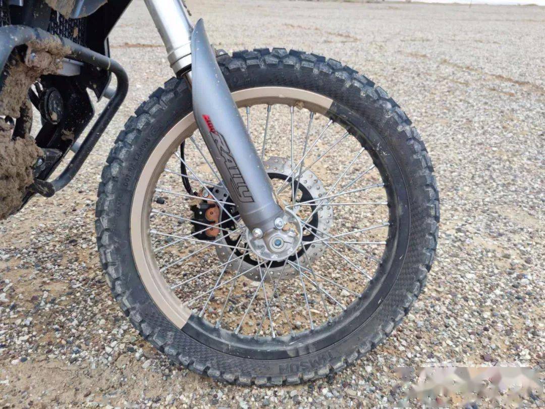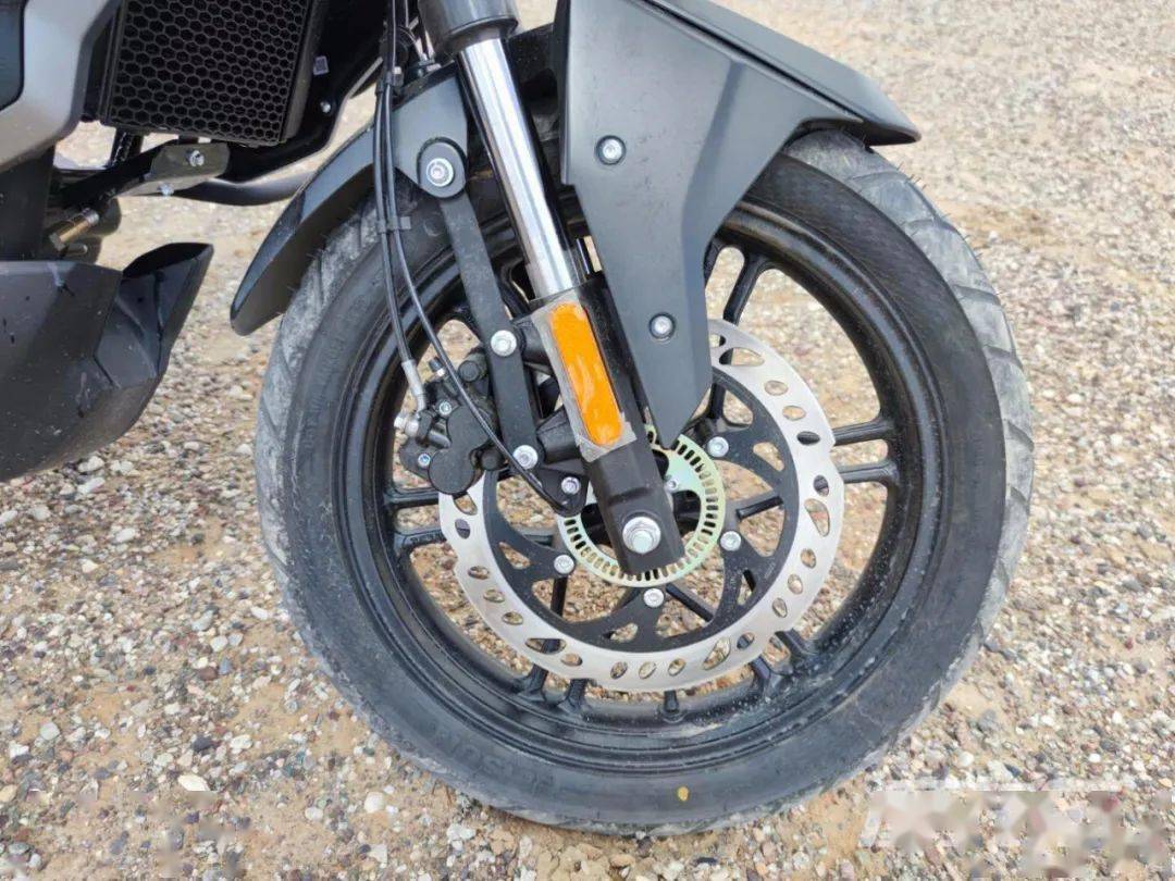 原廠狀態(tài)的300GY RALLY座高為850mm,離地間隙235mm,輪胎方面為前90/90-19,后110/90-17的組合,同樣為高階騎手保留了改裝空間。前制動為單向雙活塞卡鉗配265mm制動盤,后制動為單活塞卡鉗配220mm制動盤,配備賽福ABS。素車狀態(tài)下,300GY RALLY有著接近50:50的前后比重,不過對于許多可能用于摩旅的騎手來說,后部過多的載重會使重心后移,在非鋪裝路況下會使前輪導(dǎo)向性降低,這點后續(xù)的試駕感受篇中再展開說。