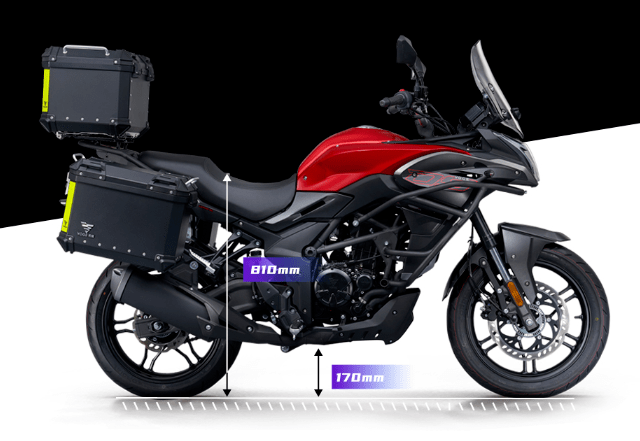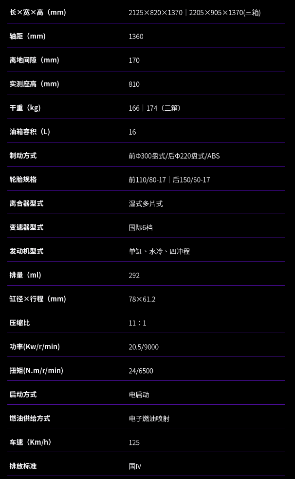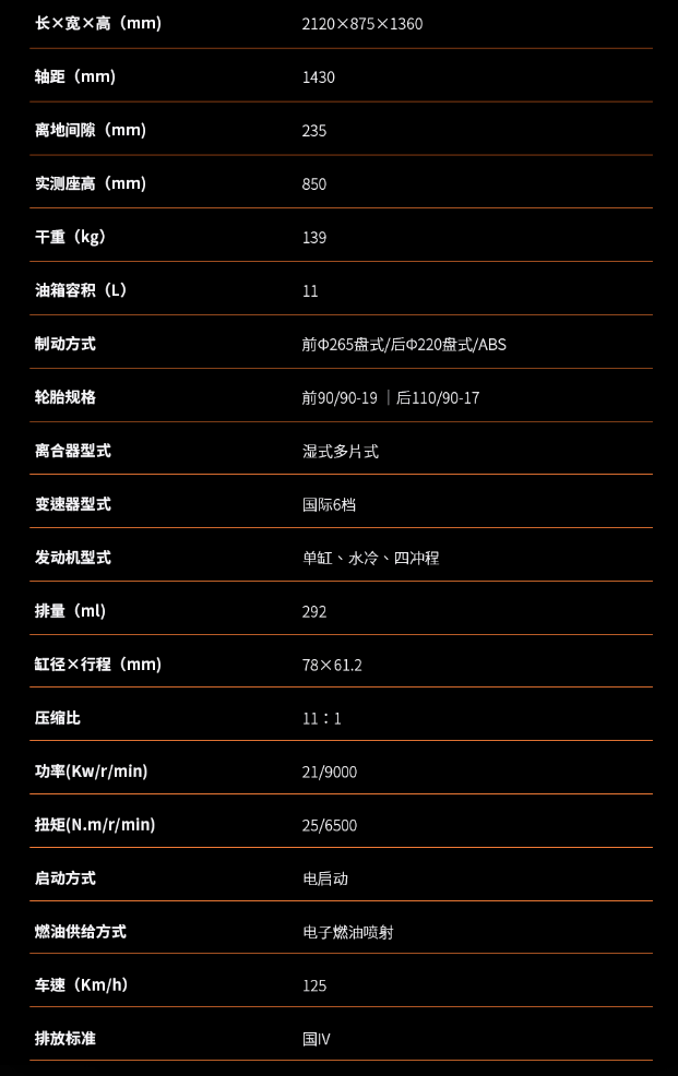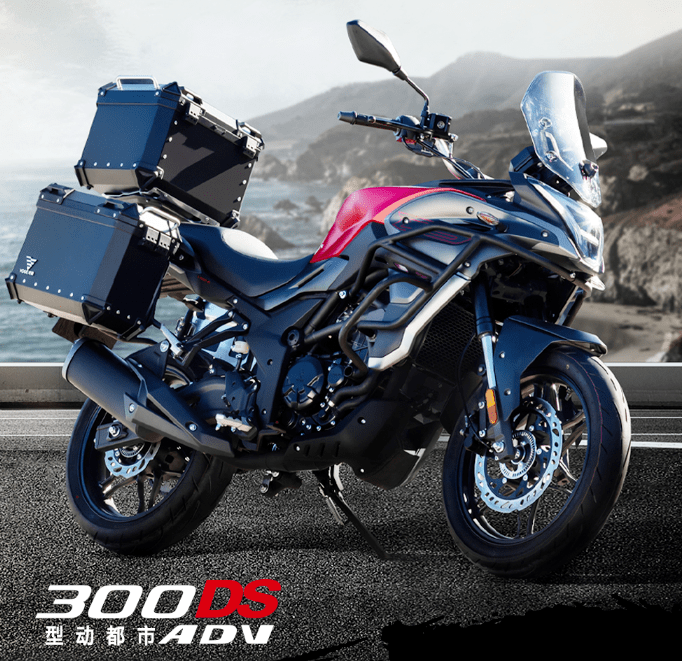 底盤方面采用鋼管式車架加倒立式前叉及預(yù)載可調(diào)中置后減震的組合,輪胎規(guī)格前110/80-17,后輪150/60-17。前制動單向雙活塞卡鉗配300mm制動盤,后制動單活塞卡鉗配220mm制動盤,同樣搭載賽福的ABS系統(tǒng)。座高810mm,最小離地間隙170mm。其他方面300DS采用全車LED光源,16L的油箱容積,更大尺寸的負顯液晶儀表,干重166kg,濕重狀態(tài)大概在180kg左右。