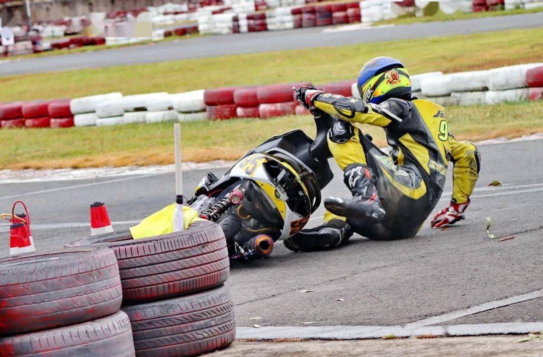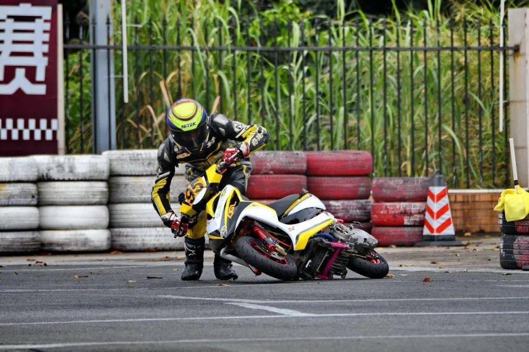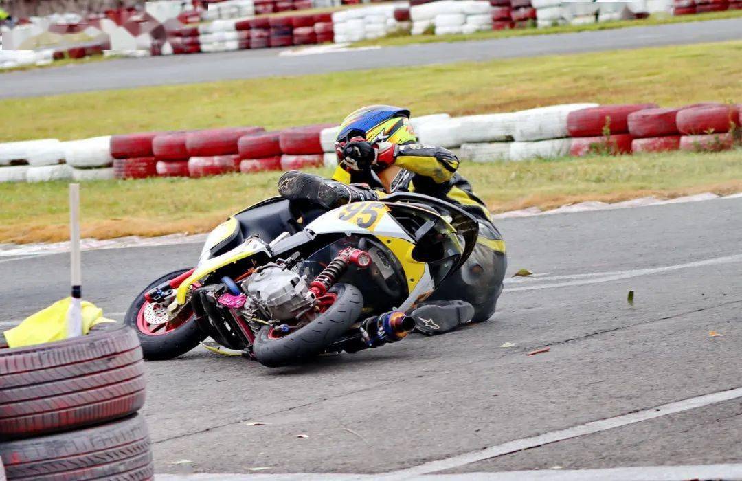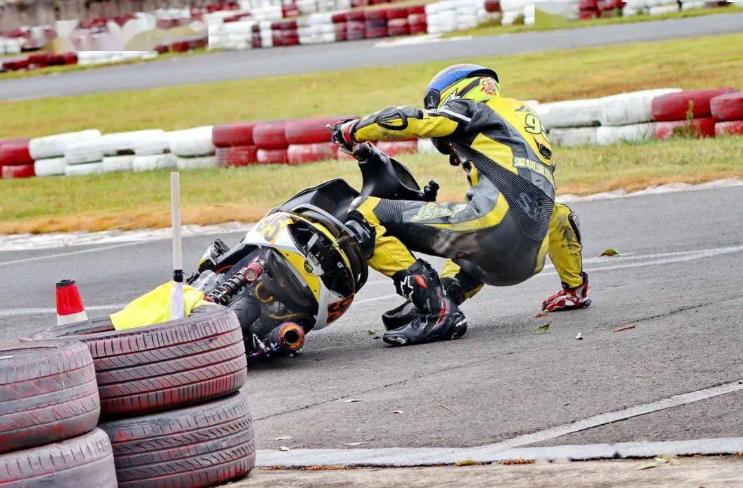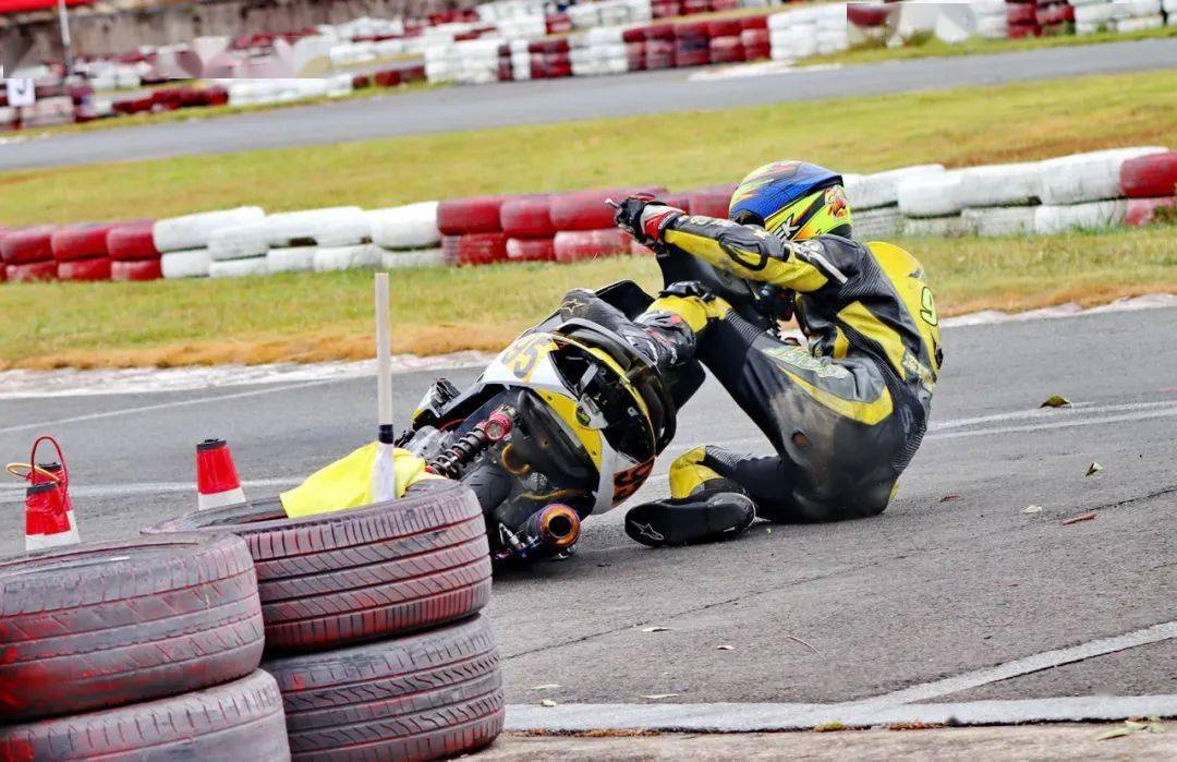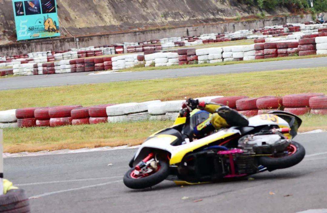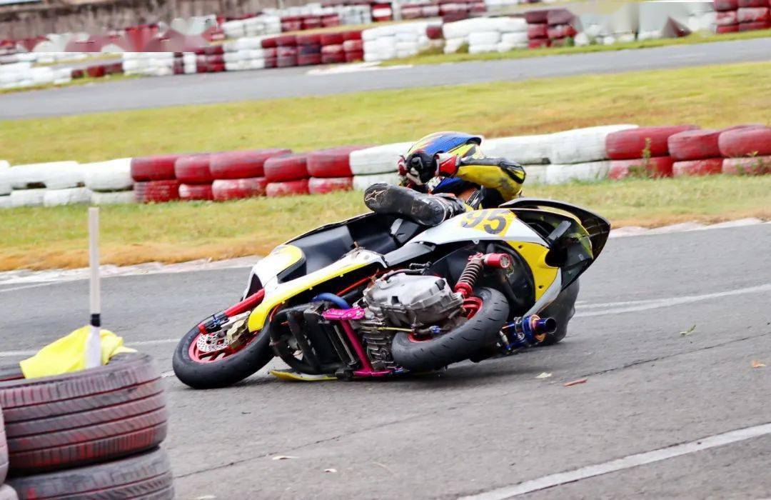 下面的圖片,艾瑞森輪胎改裝踏板 150 cc 公開(kāi)組、決賽 1(第一節(jié)比賽),駕駛 95 號(hào)車(chē)的倪天在第 2 圈的最后一個(gè)彎道摔倒。他很快就扶起賽車(chē)、并重返賽道。但到了第 9 圈,他因?yàn)橘愜?chē)故障而提前退出了比賽。