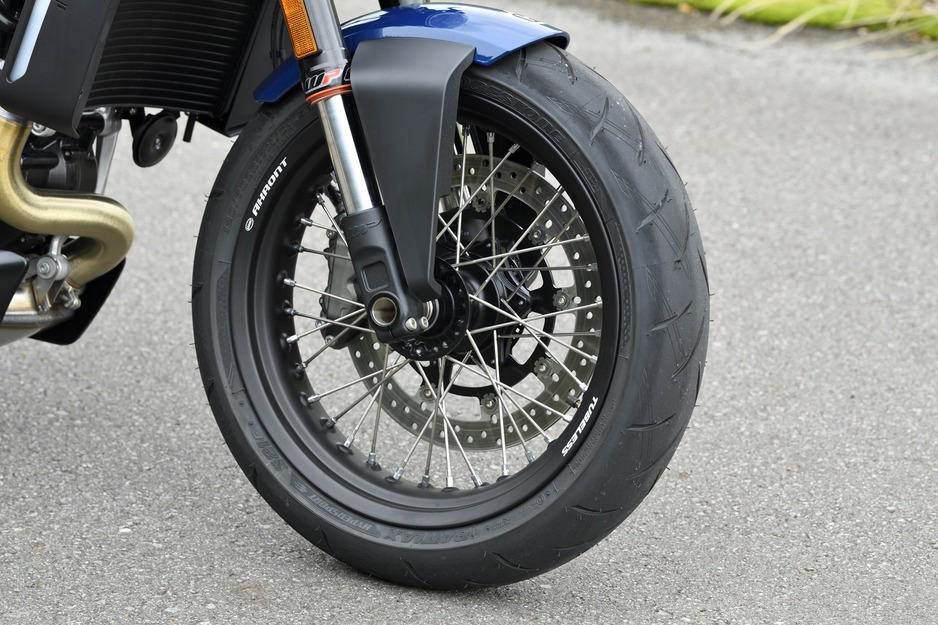 前制動是320mm單盤,廠家可能是因?yàn)樘幱跍p重的考慮,給予這樣的配置;同樣由于車身比較輕巧,單盤也可以有效地控制減速,在這臺機(jī)器上,可以感覺到可以優(yōu)雅運(yùn)動的性格。