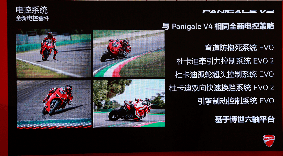 ·基于博世六軸平臺電控系統(tǒng):彎道防抱死系統(tǒng) EVO;杜卡迪牽引力控制系統(tǒng) EVO 2(DTC)EVO 2; 杜卡迪翹頭控制系統(tǒng)EVO(DWC); 杜卡迪雙向快速換擋系統(tǒng) EVO 2;引擎制動系統(tǒng) EVO (EBC)EVO