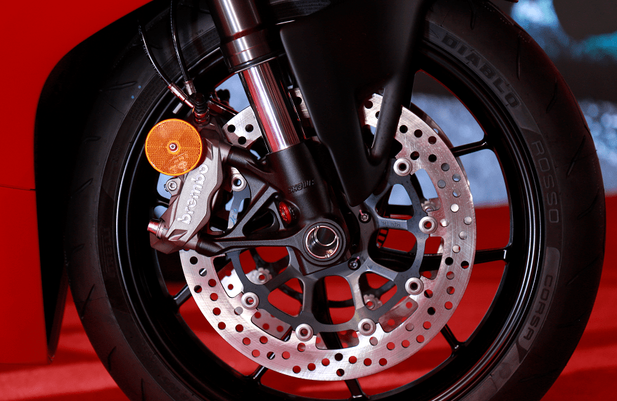 減震系統(tǒng)采用的是前Showa BPF 43mm倒置式前叉,預(yù)載和壓縮、回彈阻尼均可調(diào),這套前減震也是很多公升級運動車款上在使用的減震,后減震則是歐洲知名品牌ZF減震系統(tǒng)提供的單筒減震器,同樣全可調(diào),側(cè)置安裝在車架上,這種安裝方式也是杜卡迪仿賽車款的標(biāo)志之一。前制動系統(tǒng)為兩個Brembo M4.32單體卡鉗配320mm制動盤,后制動為雙活塞卡鉗配245mm制動盤,制動系統(tǒng)也是頂級配備。輪胎采用的是Diablo Rosso Corsa II輪胎,這款胎很適合在這款Panigale V2上使用,后輪有三個不同應(yīng)用區(qū)域兩種膠料配方,最大限度提供良好的抓地力。