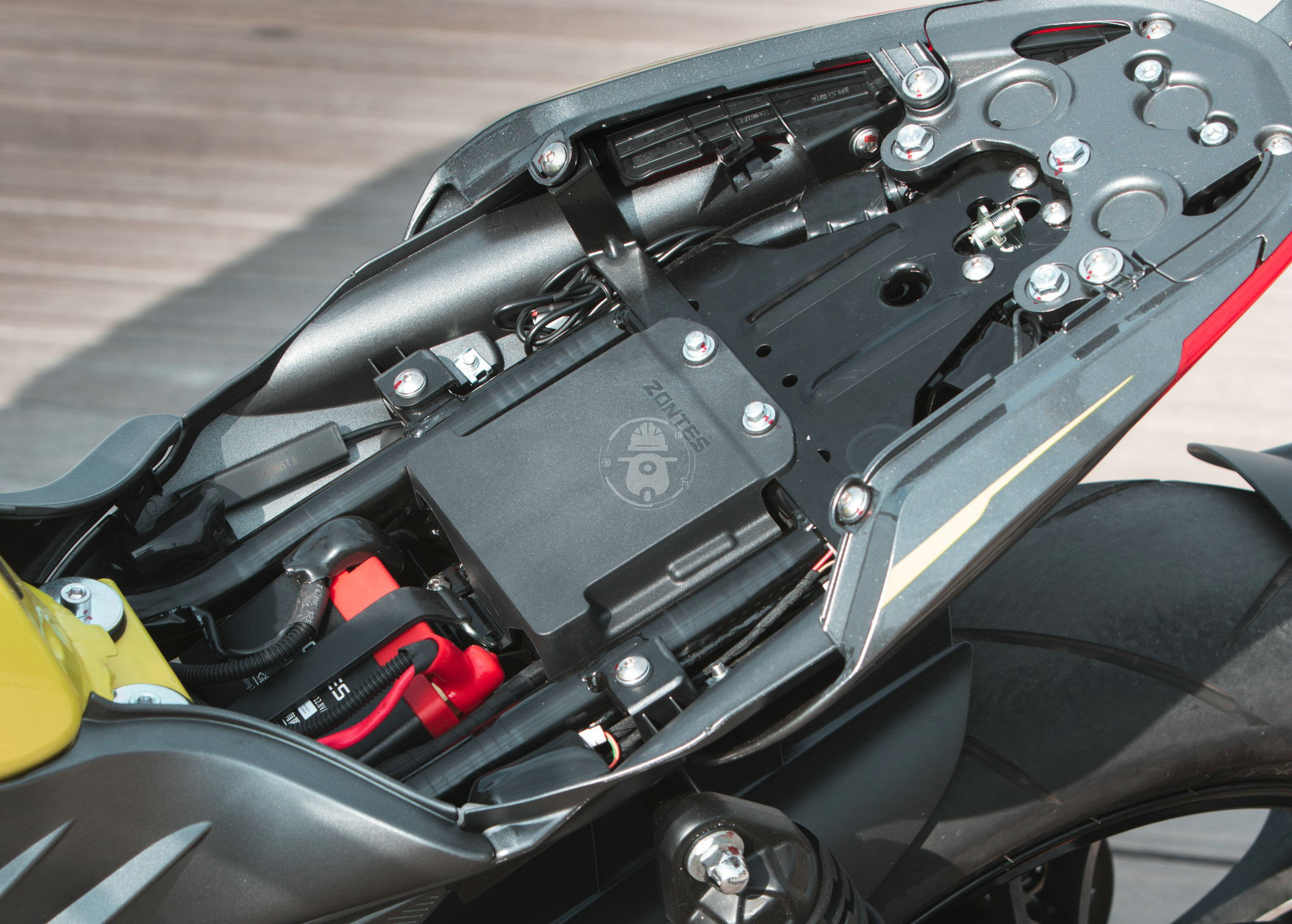 打開(kāi)坐墊能看到座艙布局比較規(guī)整沒(méi)有凌亂的走線,整個(gè)座艙非常緊湊基本沒(méi)有多余的空間。據(jù)悉升仕310的電池是專門(mén)定制的膠體電池,容量更大耐低溫性能好。