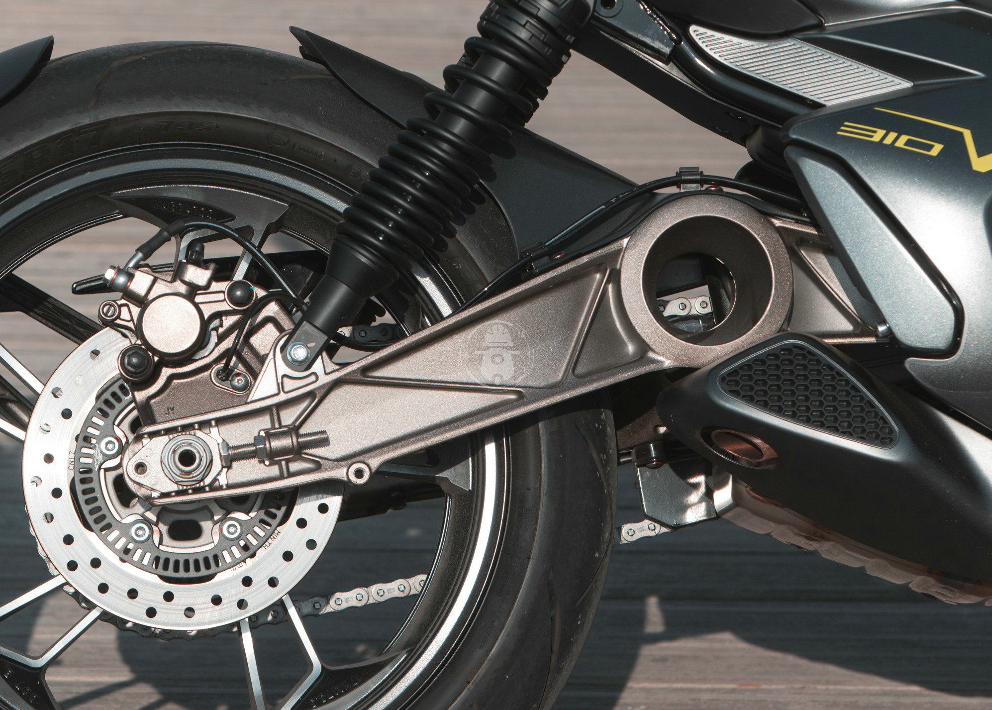 前制動(dòng)為單盤(pán)+單向雙活塞卡鉗,后制動(dòng)為單盤(pán)+單向雙活塞,前后剎車均有BOSCH9.1M ABS保駕護(hù)航。前倒立式前叉無(wú)調(diào)節(jié)功能,后雙槍彈簧避震,之前很多人吐槽說(shuō)雙后避震不好看,運(yùn)動(dòng)感也有所欠缺,現(xiàn)在升仕已經(jīng)推出了310V的單搖臂版本再無(wú)遺憾。