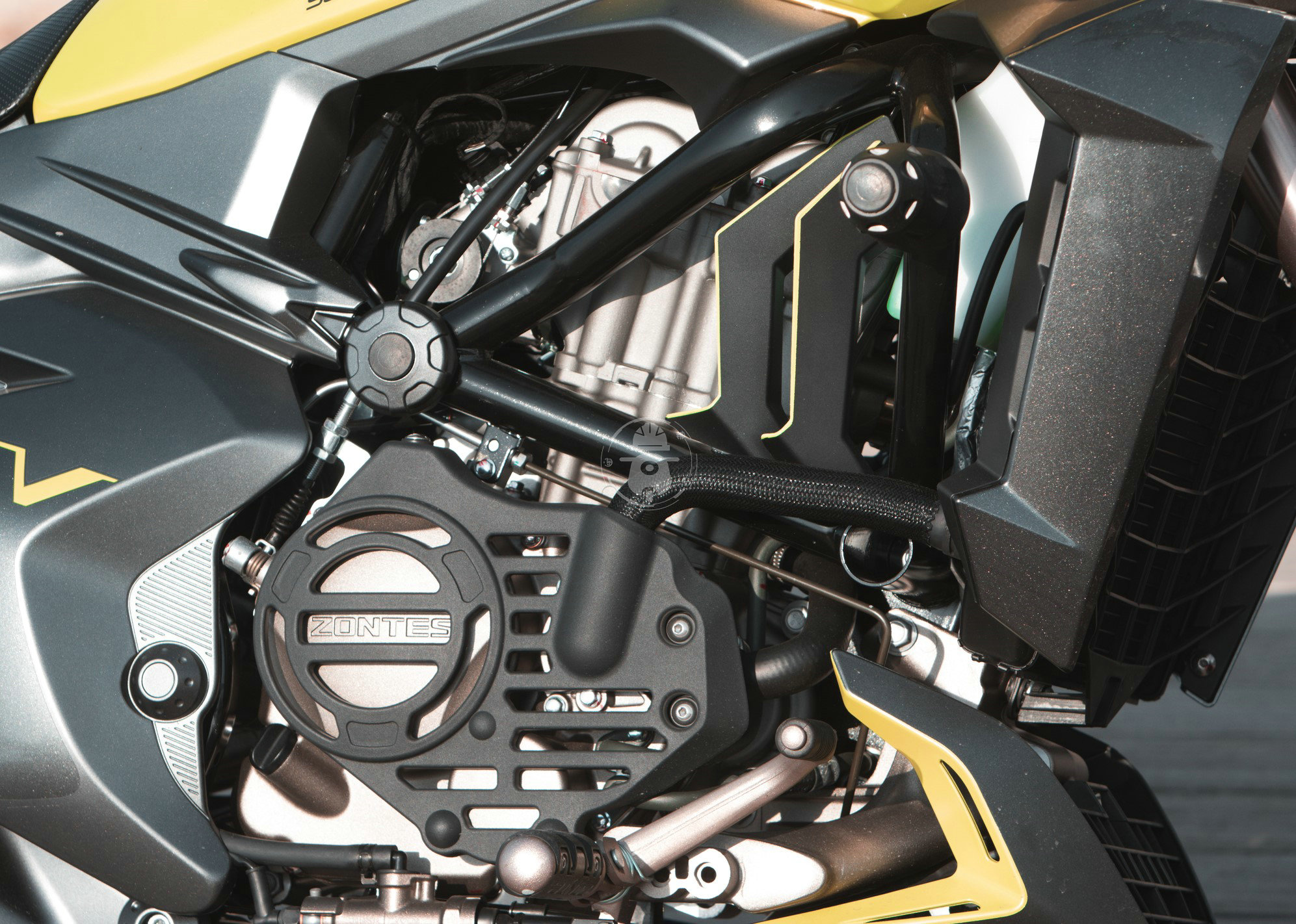 大膽的后搖臂設(shè)計(jì)再度刷新的國(guó)產(chǎn)摩托車的固有形象,如果說(shuō)半鏤空式的后搖臂有借鑒KTM之嫌,那么后搖臂與車架的結(jié)合處,采用中空的這種設(shè)計(jì),想必是在國(guó)產(chǎn)摩托車當(dāng)中絕無(wú)僅有的存在,視覺(jué)沖擊效果極強(qiáng)。另外值得一提的是,排氣管蜂窩罩的右上角就是隱藏式乘客腳踏,這個(gè)你看出來(lái)了嗎?