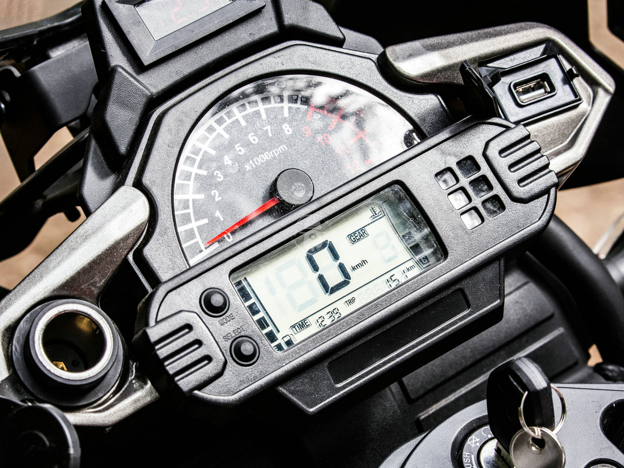 也并不是說這個儀表完全一無是處,至少充電接口的設(shè)計十分方便,左側(cè)有個點煙器接口,右側(cè)有個USB接口,都有防水蓋的設(shè)計,手機什么的充電十分方便。