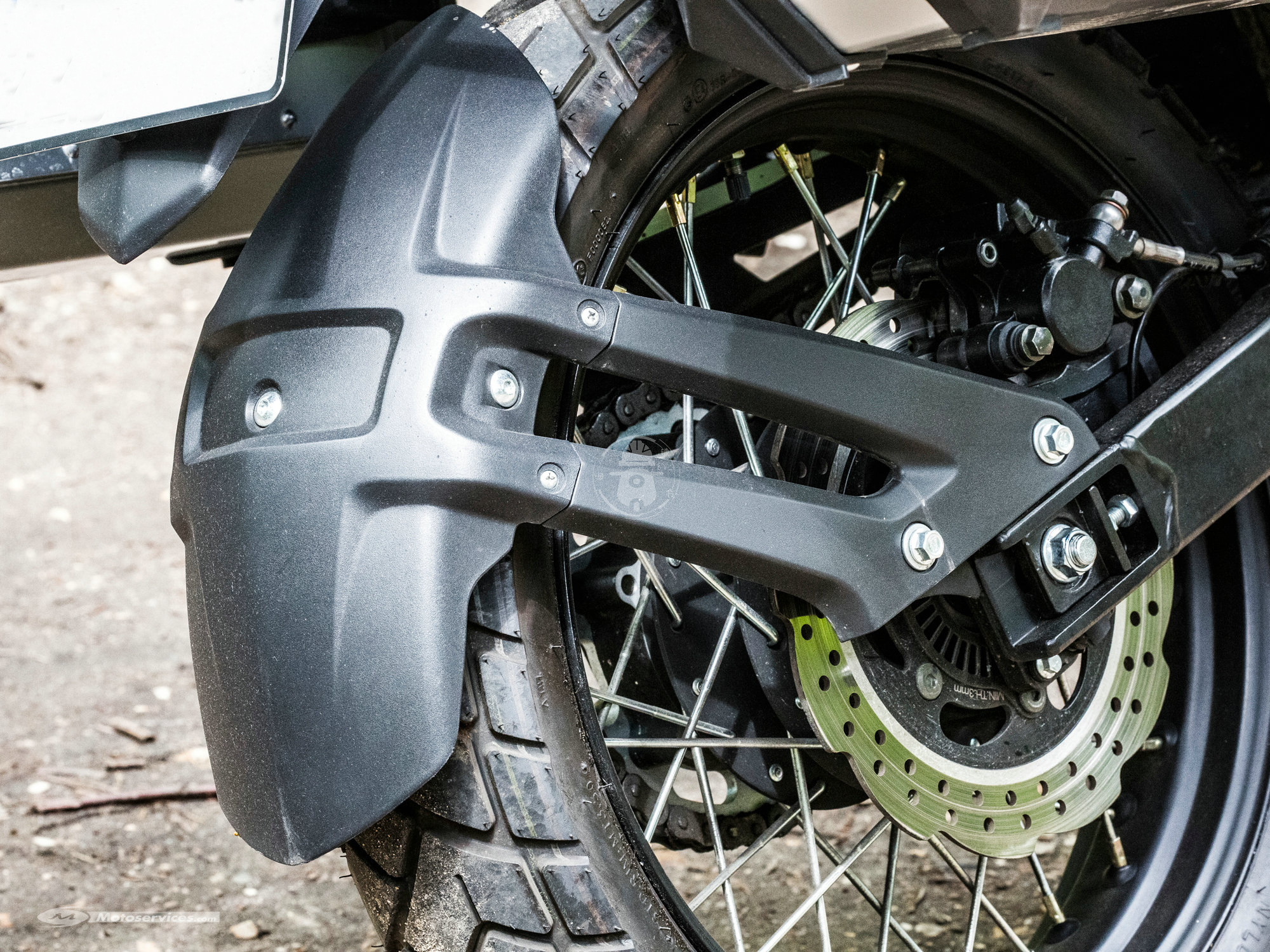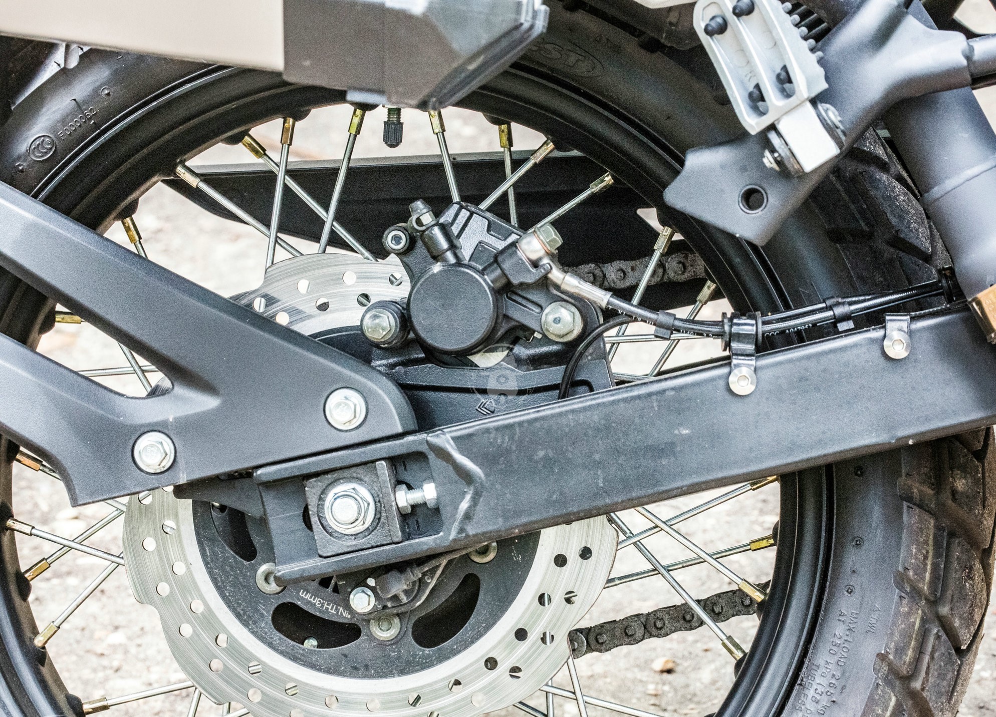 后剎是單碟固定盤+單活塞卡鉗的形式。前后輪圈都是鋼絲條幅的形式越野能力不錯,搭配正新的多功能真空胎,擁有一定的爛路適應(yīng)能力。
