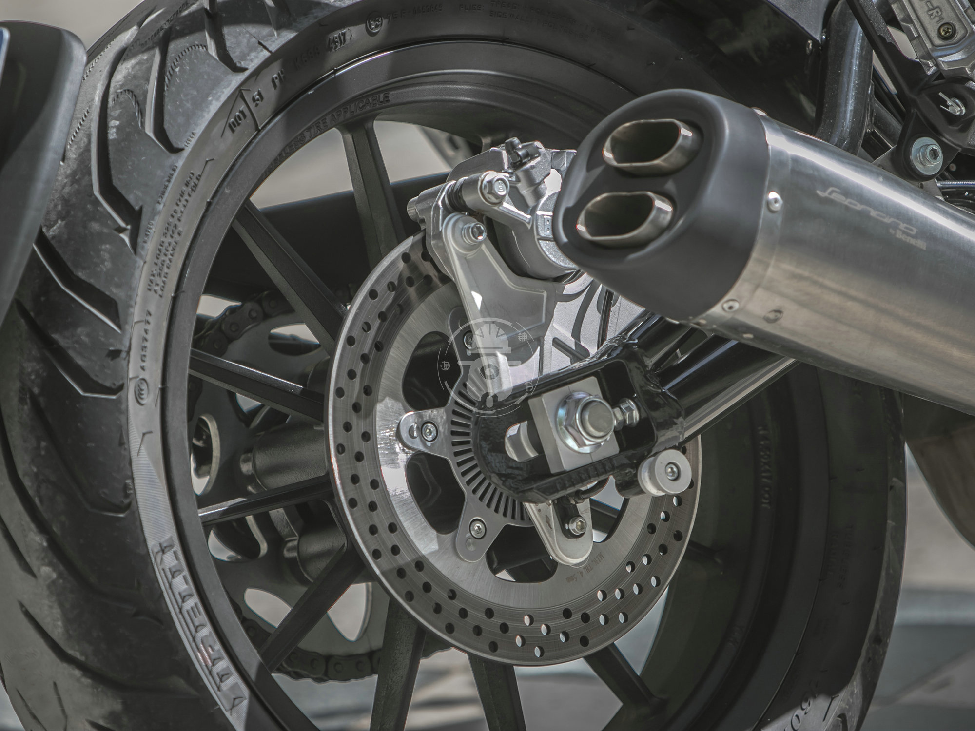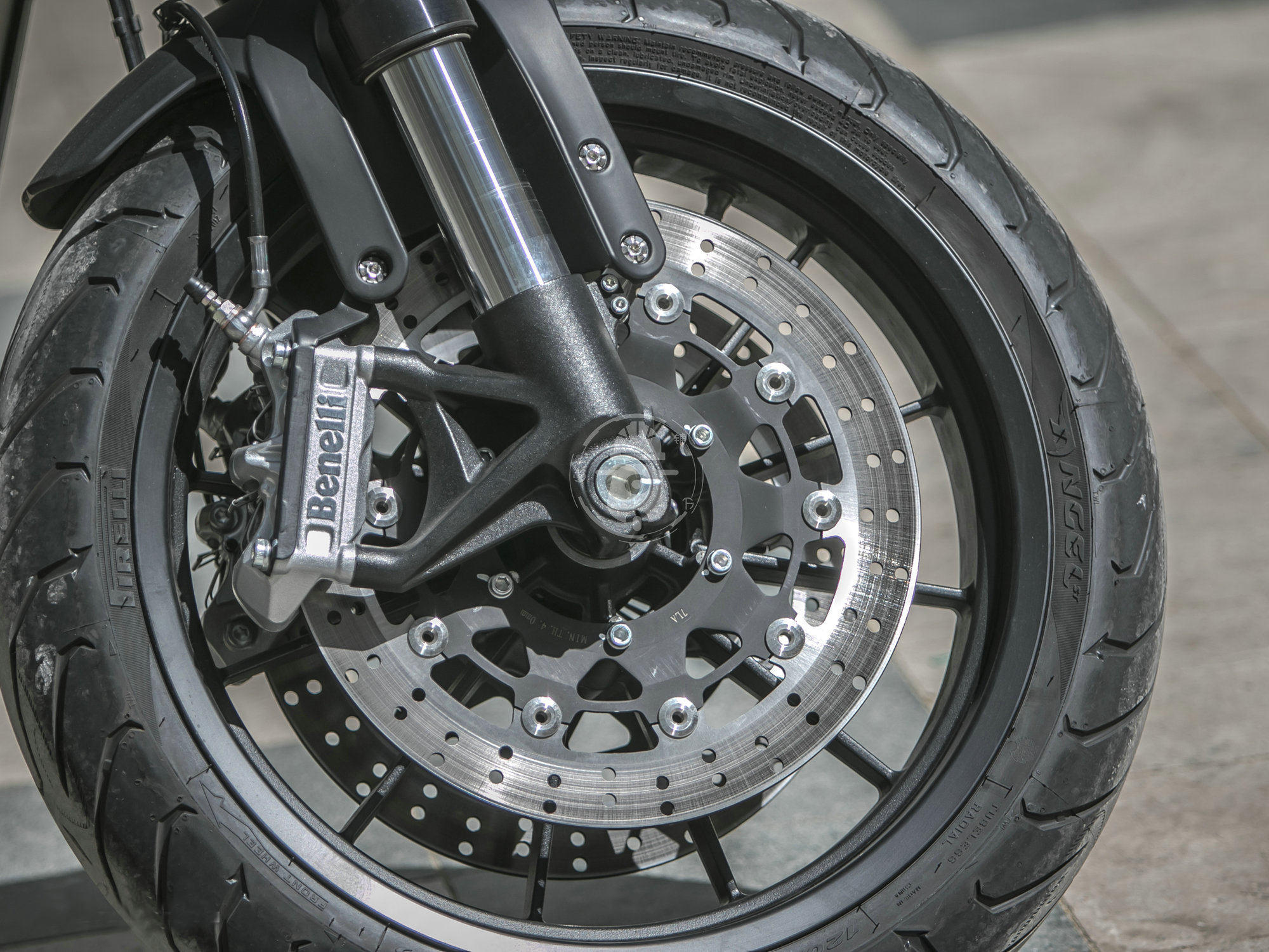 前320mm雙半浮動碟加上對向四活塞卡鉗,后260mm單碟加上單向單活塞卡鉗,前后剎車均有ABS系統(tǒng)的加持,對于一款復(fù)古摩托車來說,這個規(guī)格完全能夠滿足日常使用,倍耐力Angel ST輪胎提供的抓地力也非常不錯,平時跑山壓彎應(yīng)能夠玩的盡興。