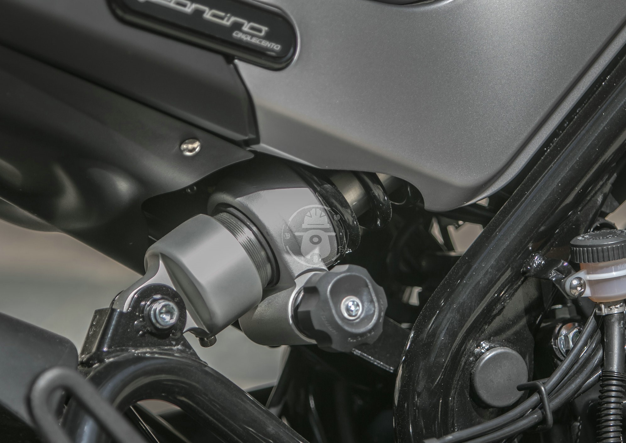 倒立式前叉擁有125mm的行程,不具備調(diào)節(jié)功能;后避震為水平加載彈簧式減震,擁有預(yù)載可調(diào)功能,而且配備了專門的調(diào)節(jié)旋鈕,無需借助工具即可完成調(diào)整,這一配置在國產(chǎn)摩托車上還十分少見。