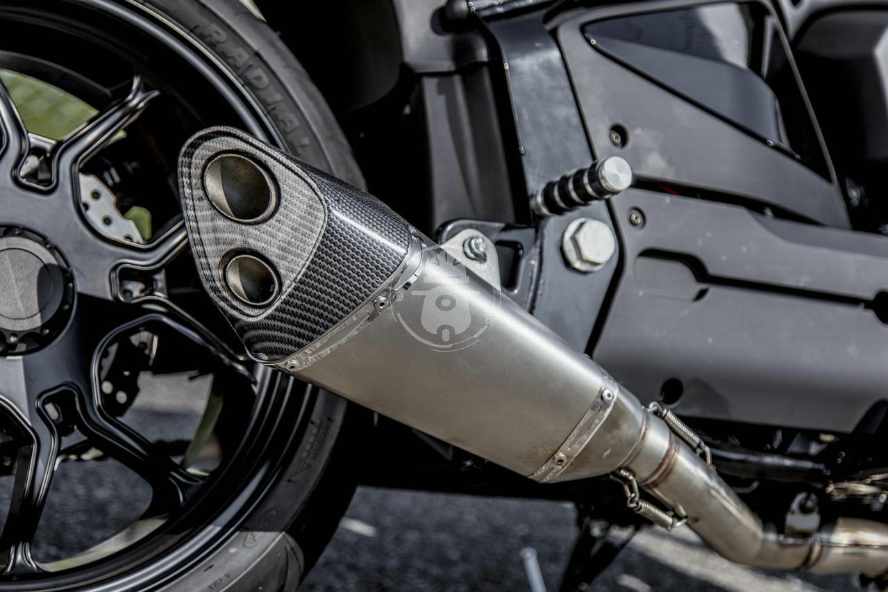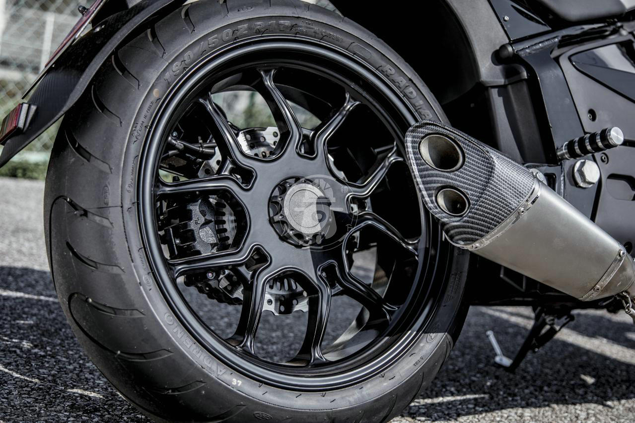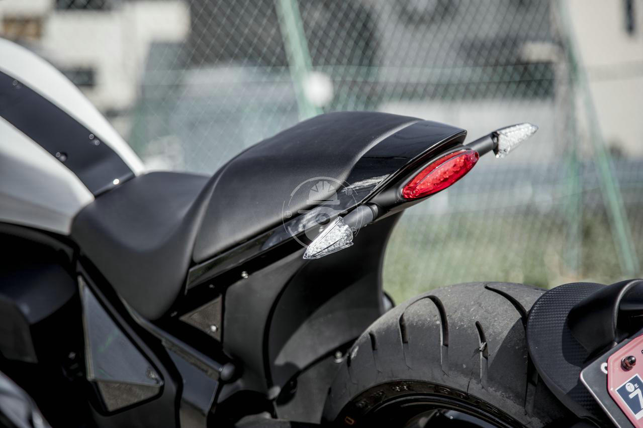 190 / 50-17尺寸的大后輪胎是正新的ADRENO子午線輪胎,如你所見它使用鋁制單搖臂形式的后叉,后輪轂的設計也十分帶感,排氣管的位置也充分凸顯出單搖臂的美感。