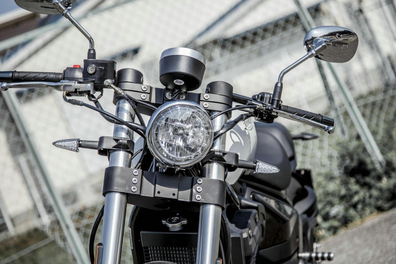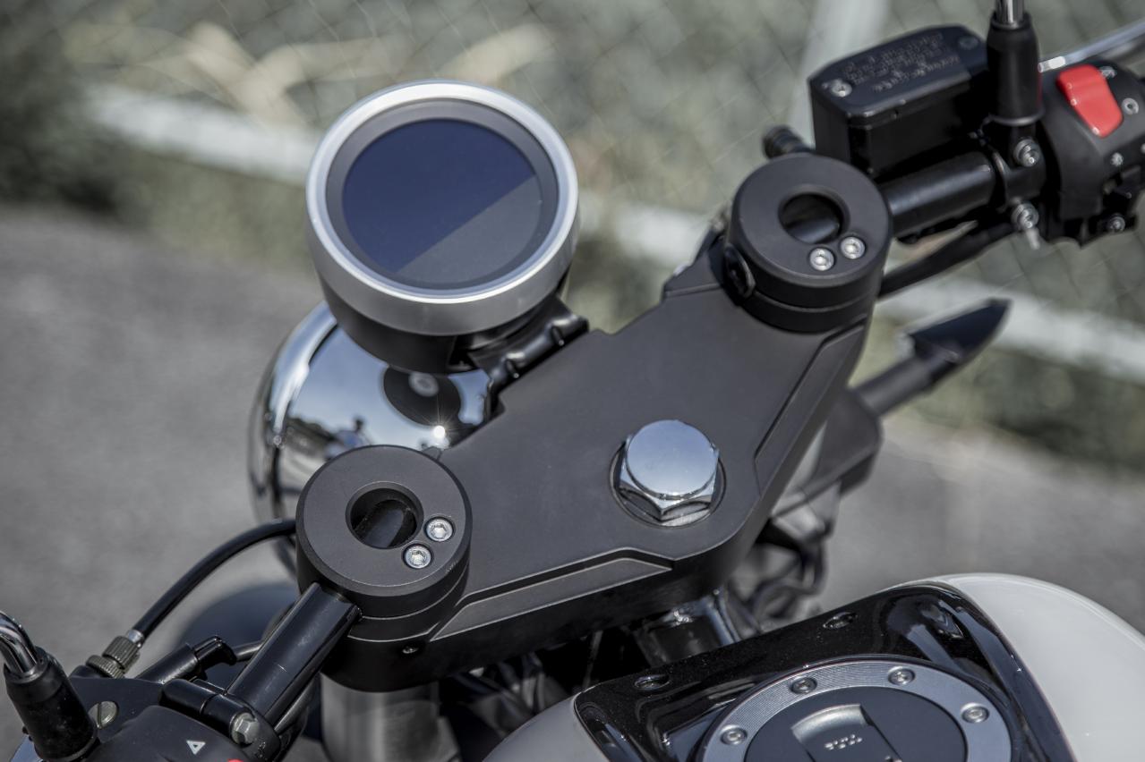 美式巡航上十分少見的分離式手把,安裝在上聯(lián)板的正上方,這種獨特設計令人印象深刻,只有在咖啡賽車風格的復古摩托或者仿賽上才能看到這種車把的設計。