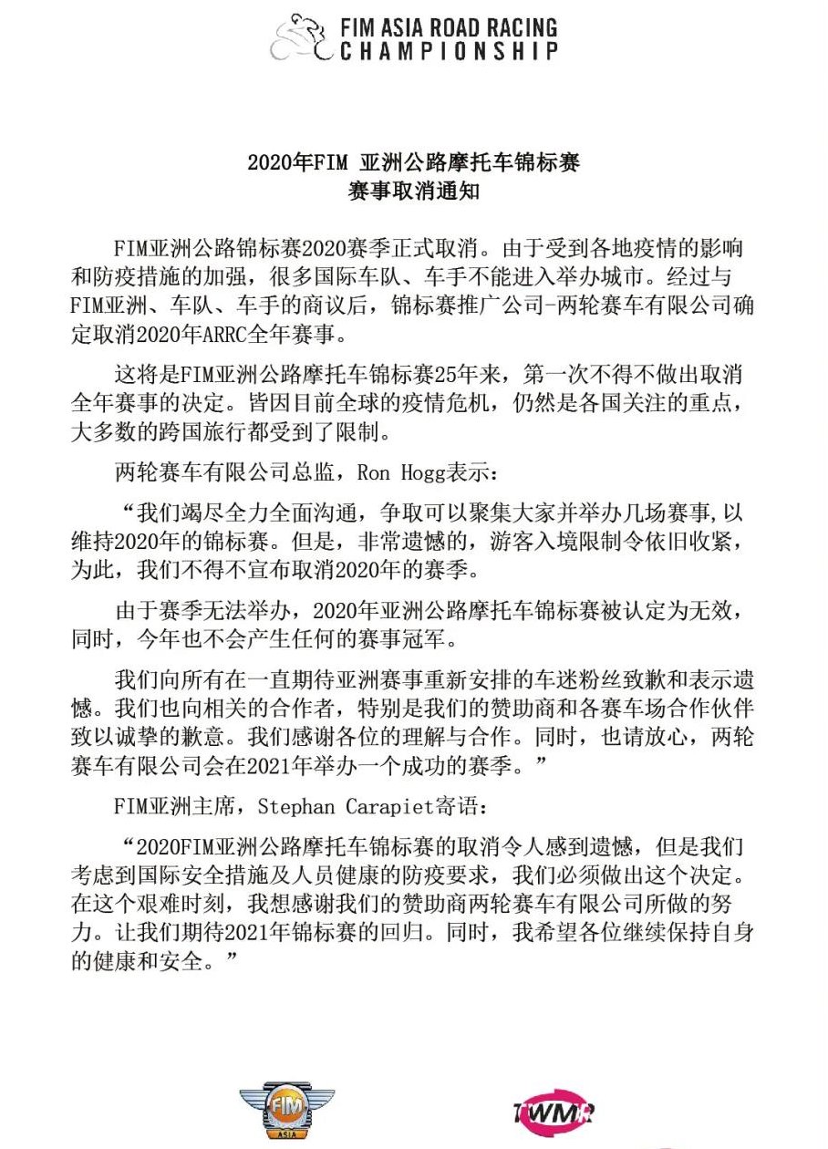 核心提示:2020年FIM亞洲公路摩托車錦標(biāo)賽取消通知