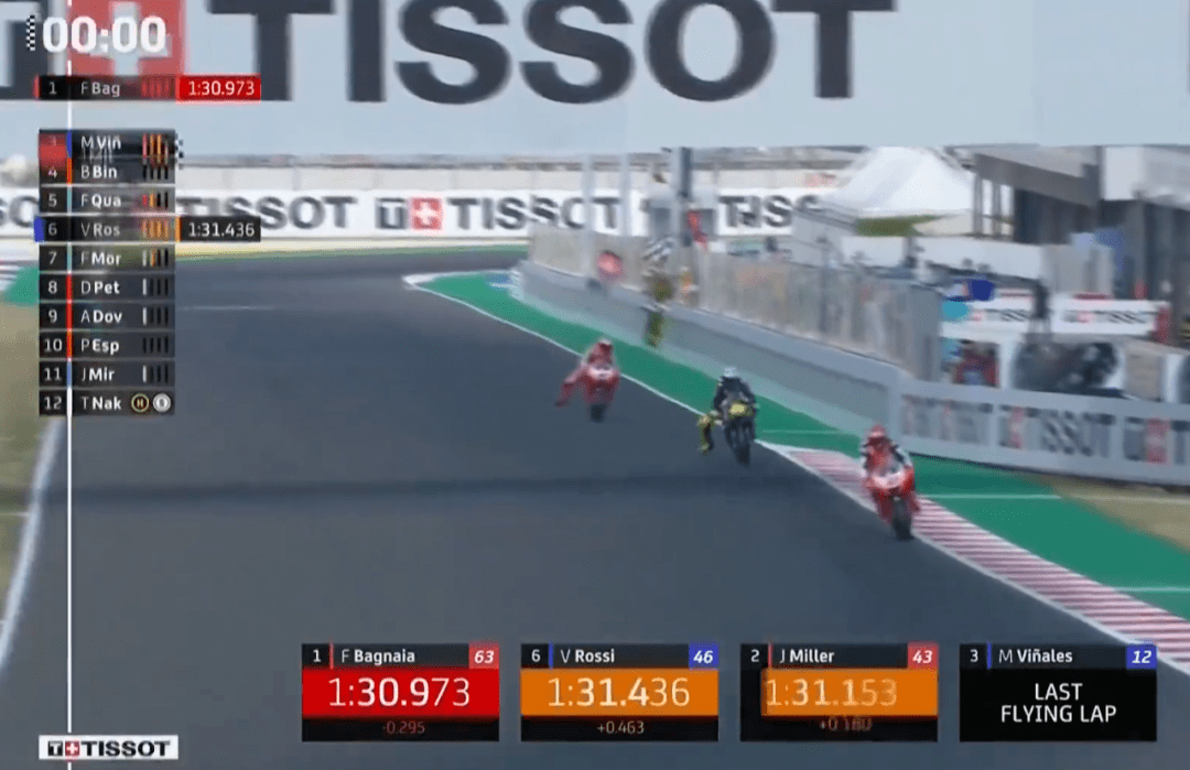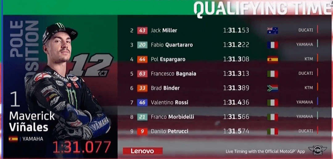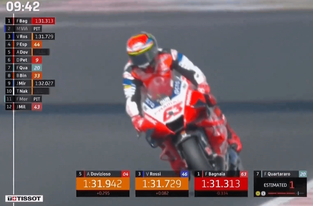 Q2的比賽不再是上一場(chǎng)雅馬哈內(nèi)斗了,成為了雅馬哈和杜卡迪間的競(jìng)爭(zhēng),準(zhǔn)確說是維尼和巴哥納亞間的競(jìng)爭(zhēng)。維尼延續(xù)了上一場(chǎng)火熱狀態(tài),上來就跑出了1:31.647拿到第1,上一場(chǎng)第2的巴哥納亞也不示弱,1:31.313做出回應(yīng)。半場(chǎng)過后,維尼再來,1:31.268再次上到第1,巴哥納亞雖然是二年級(jí)新秀,但不是吃素的,直接跑出1:30.973,不過這個(gè)成績(jī)因?yàn)榘透缂{亞跑出了賽道而作廢。停表后,維尼1:31.077再次拿下桿位,這是維尼連續(xù)兩站拿到桿位,希望正賽不要像上一場(chǎng)那樣拉胯了。最終維尼桿位,Jack第2,小Q第3,小E第4,巴哥納亞第5,賓得第6,羅西第7,多維第10,小小馬第17。
