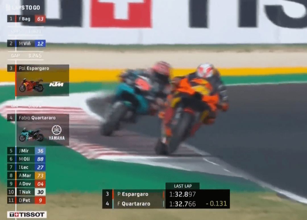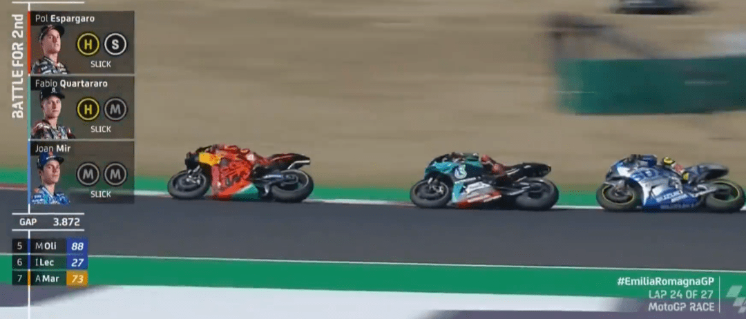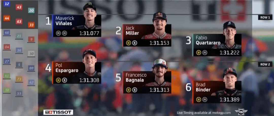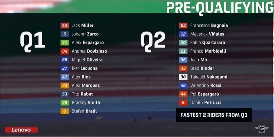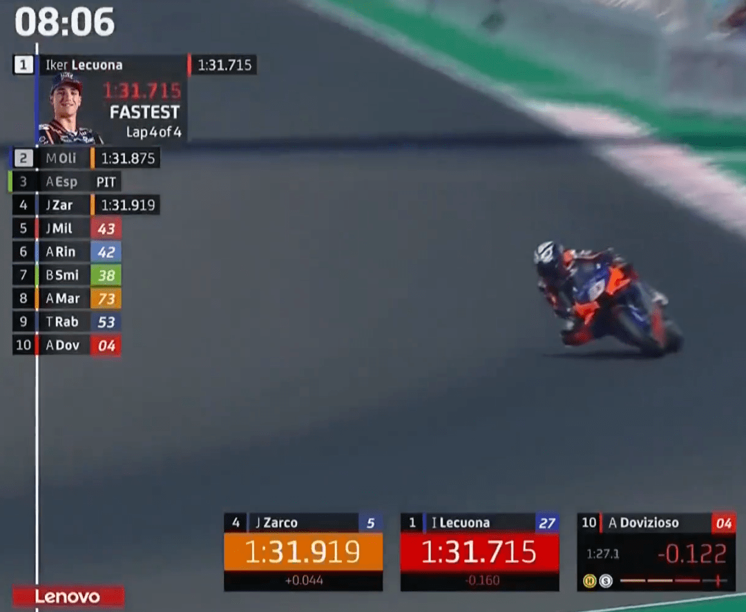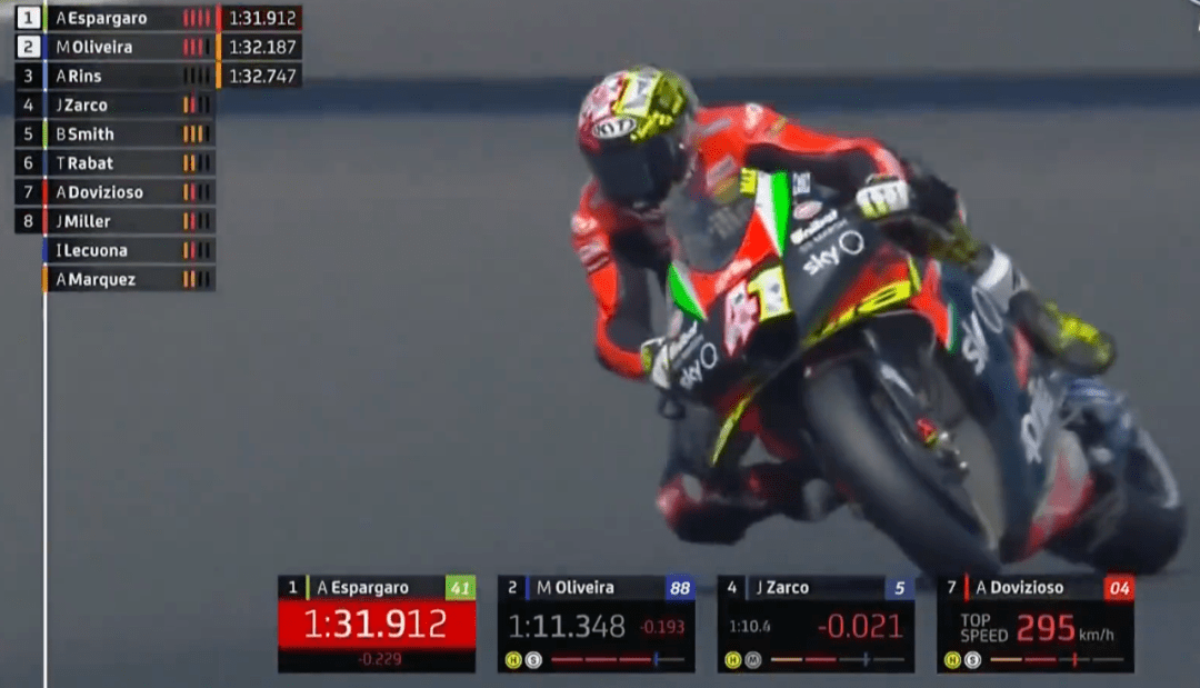 Q1上來大E又來搶鏡頭的,連續(xù)刷新自己的最快成績(jī),A廠如今也就只有Q1排位時(shí)能刷刷存在感。不過很快奧利維拉就把大E擠下去了,半場(chǎng)結(jié)束前,KTM的Lecuona跑出最快成績(jī)占領(lǐng)第1。回來一開始Jack刷出全場(chǎng)最快,這還不算完,停表后多維、Lecuona和Jack同時(shí)刷紅,不過最終Jack還是技高一籌,Jack和多維兩個(gè)杜卡迪車手進(jìn)入到Q2,KTM忙活半天,一場(chǎng)空。