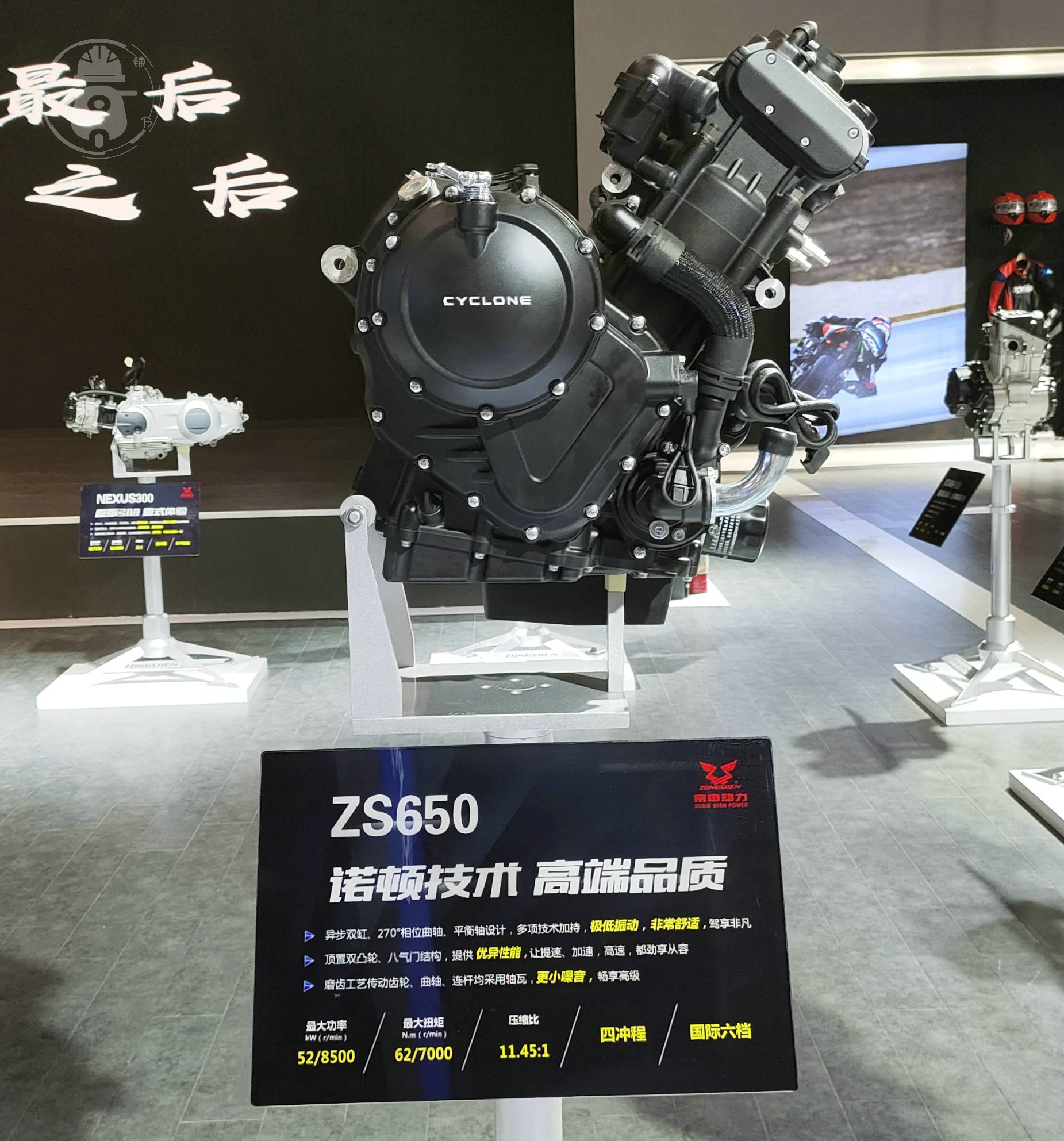 宗申展出的幾款發(fā)動(dòng)機(jī)當(dāng)中,其中有三款大排量的發(fā)動(dòng)機(jī)比較引人注意,其中擁有諾頓技術(shù)的雙缸650,大家可能非常熟悉看,目前已經(jīng)被用在RX6上。發(fā)動(dòng)機(jī)的參數(shù)也比較漂亮,就是進(jìn)展過(guò)于緩慢。