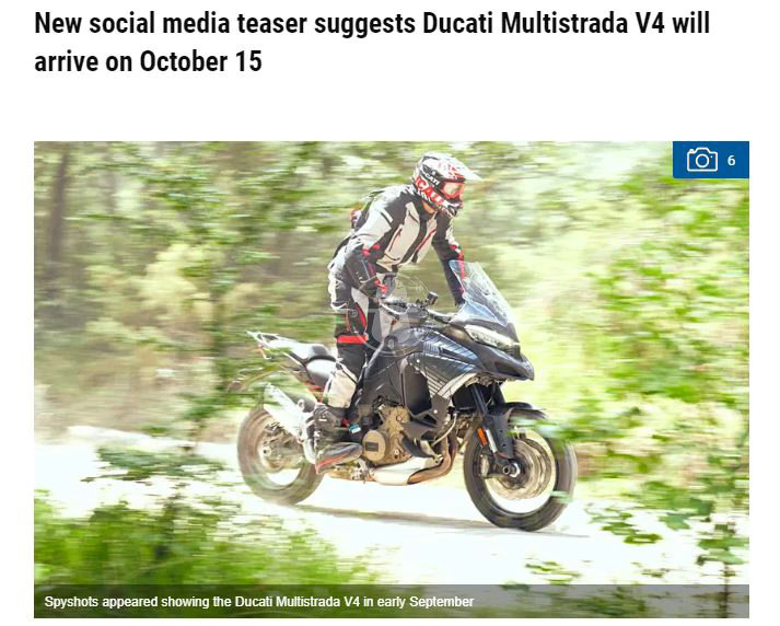 杜卡迪在其各大社交平臺上上發(fā)布了預(yù)告片,顯示了四個活塞的不同圖片,并描述:“ 4比2輕。它也可以更緊湊。” 杜卡迪還在其主頁上推出了該新車型的登陸頁面,列出了計劃在10月1日,10月8日和10月13日發(fā)布的另外三個預(yù)告。還有一個圖像描繪了四個活塞,意味著諸如Multistrada V4之類的探險車。