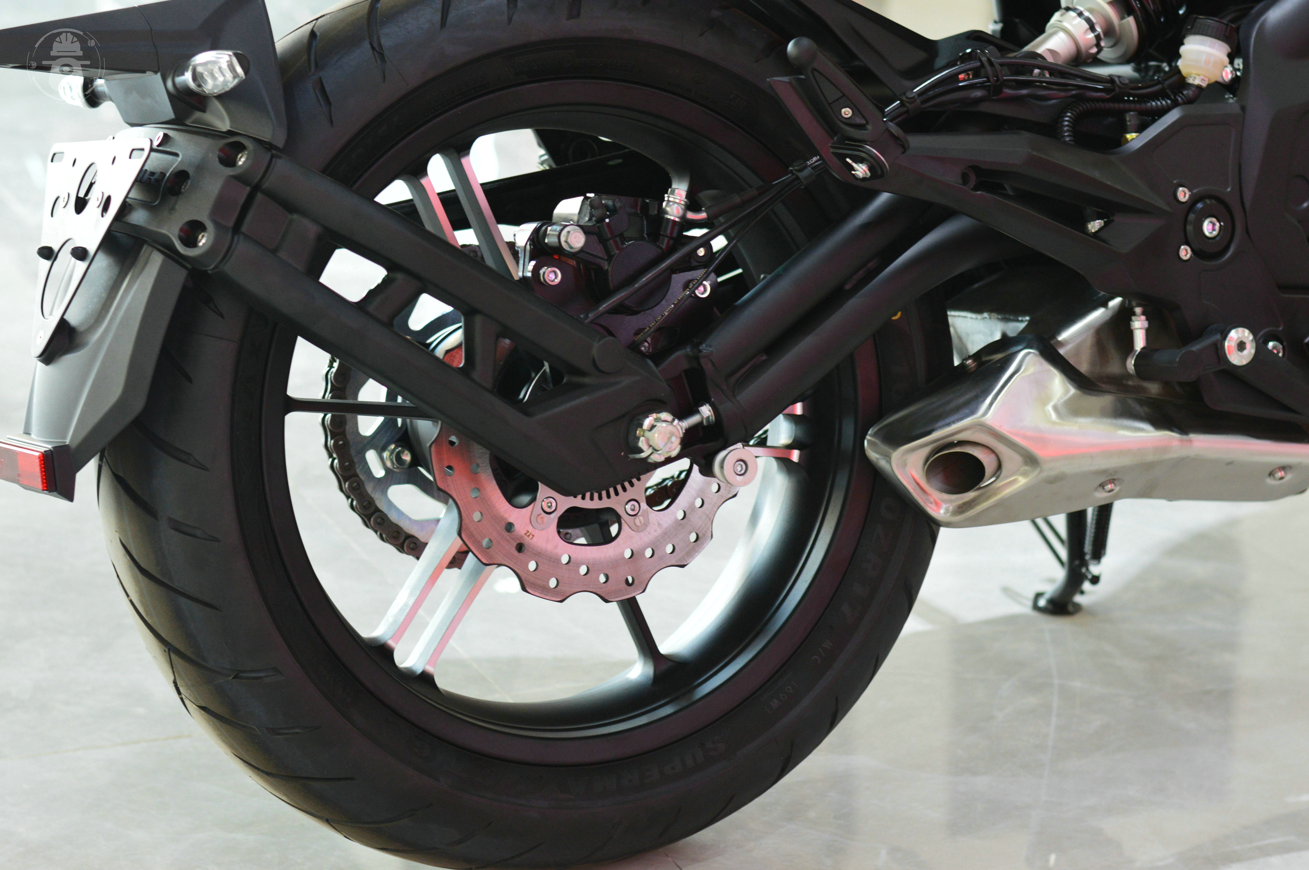追350的外觀設(shè)計(jì)并沒(méi)有什么大的槽點(diǎn),除了比較凌亂的走線之外,做工方面有明顯進(jìn)步。該車(chē)采用的依然是龍三那套車(chē)架,但是沒(méi)有“意大利式”的裸露風(fēng)格,而且車(chē)架、輪圈、后搖臂,都經(jīng)過(guò)了輕量化的處理。
