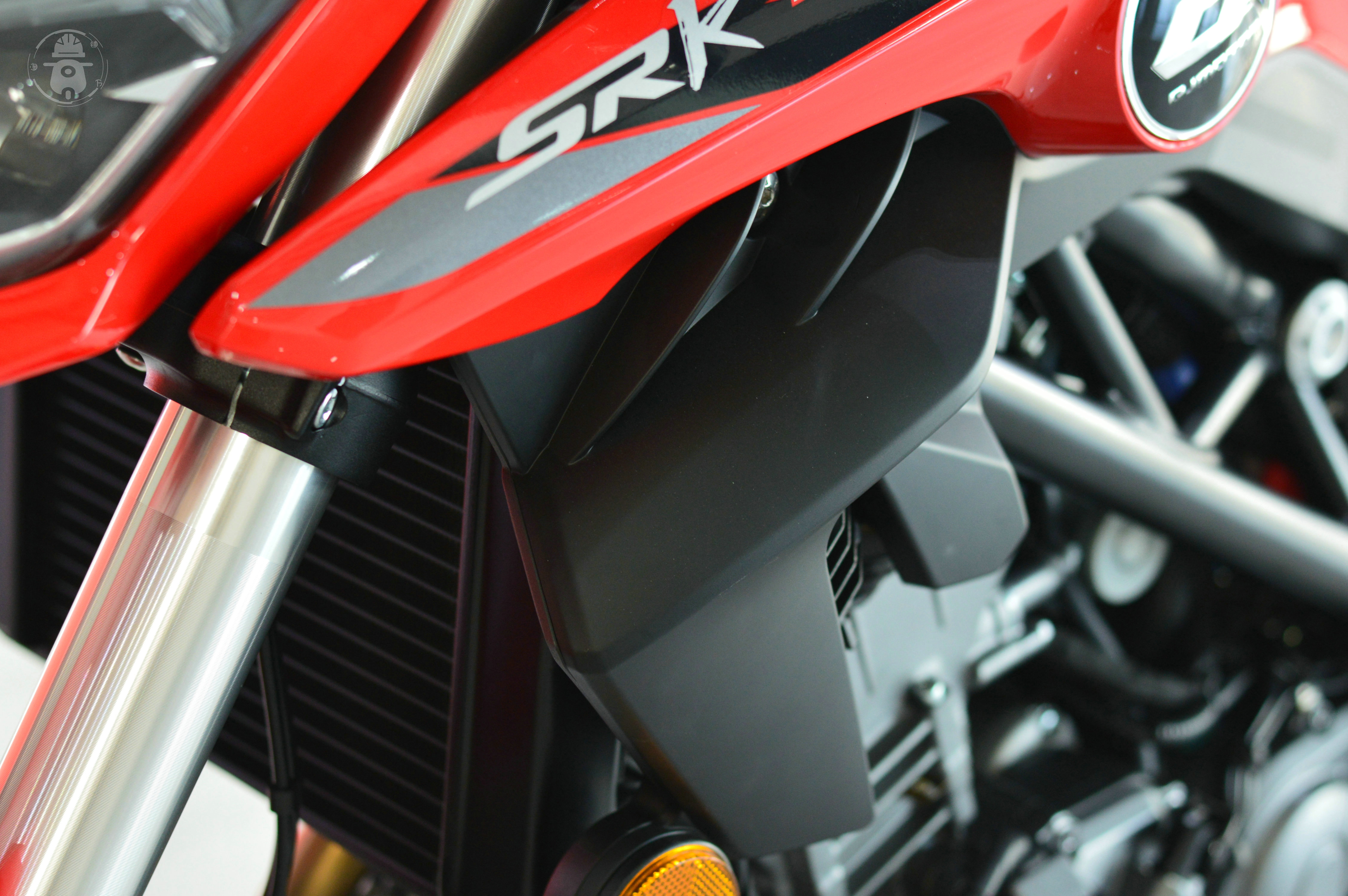 水箱護(hù)罩很有設(shè)計(jì)感,有些類(lèi)似“定風(fēng)翼”的設(shè)計(jì),這在國(guó)產(chǎn)摩托車(chē)上非常少見(jiàn),雖然并沒(méi)有什么實(shí)質(zhì)性的效果,但是對(duì)運(yùn)動(dòng)感和觀感的提升很有幫助。