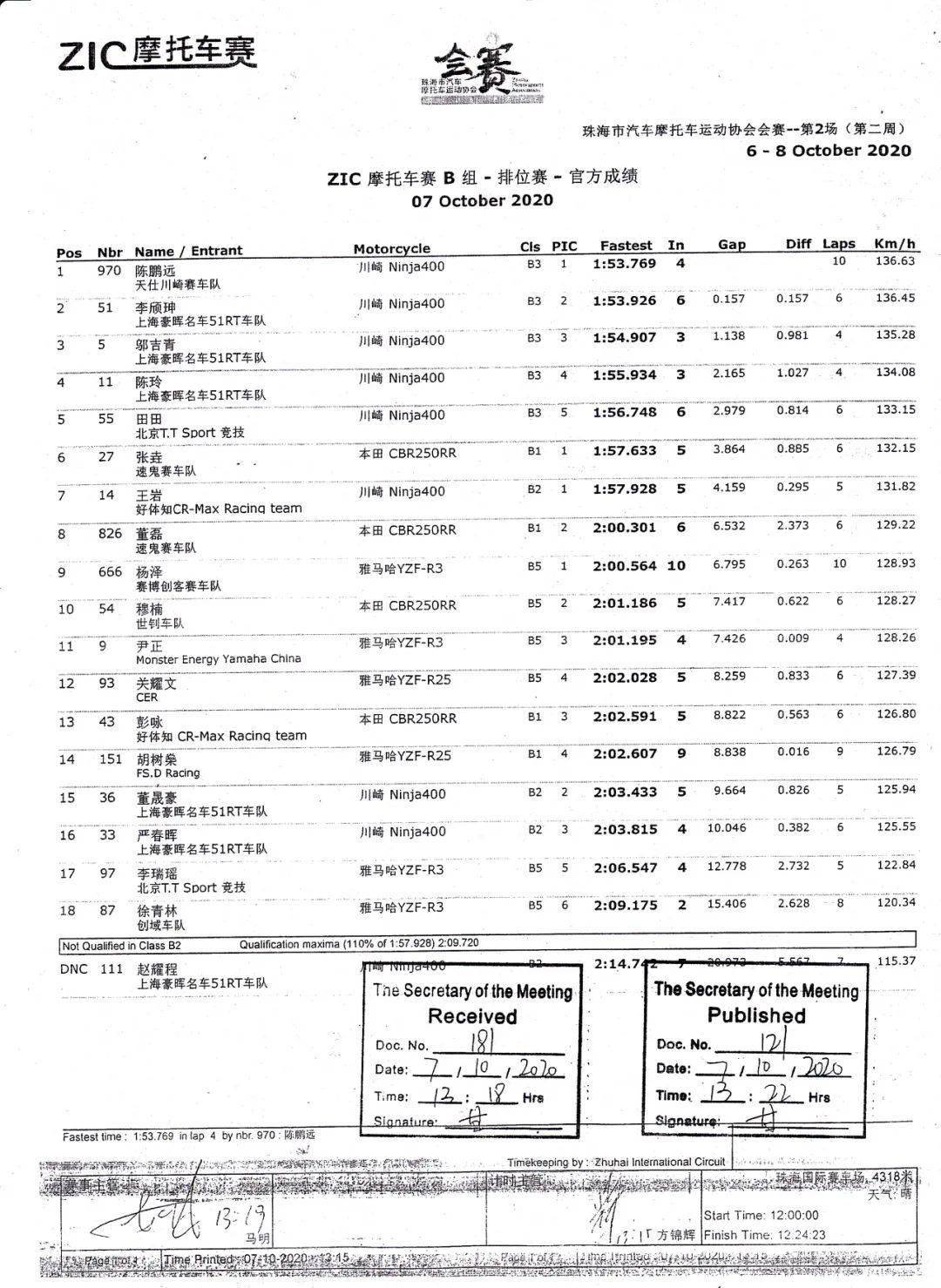 B 組方面,駕駛 970 號(hào)車、經(jīng)驗(yàn)豐富的陳鵬遠(yuǎn)排在了第一,51 號(hào)車的李頎珅、5 號(hào)車的鄔吉青分別排在了第二、第三。
