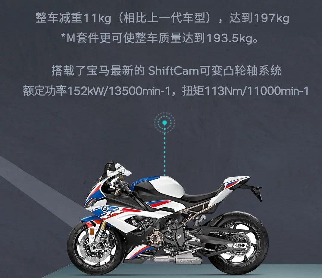 第三代S1000RR整車重量減少了11kg只有197kg,如果選用M Package的話,包括輕量化碳纖輪圈、輕量化電池等,重量會再減輕14.5kg達到193.5kg。