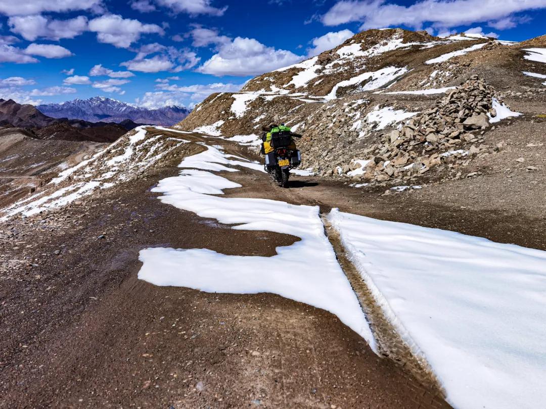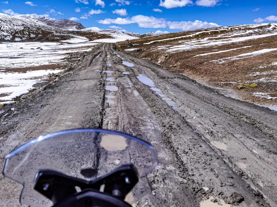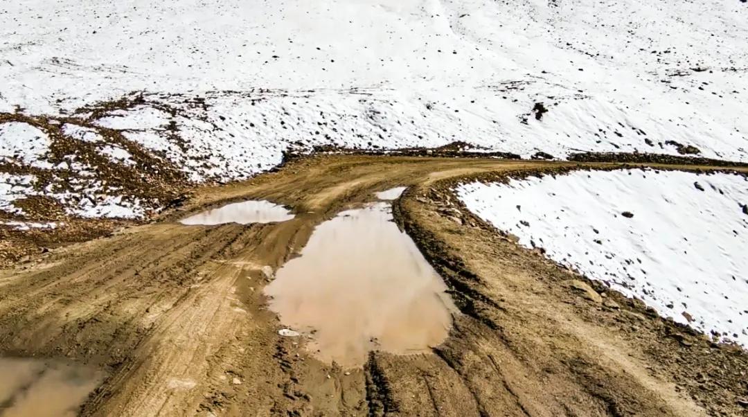 翻過埡口,背陰坡有大片積雪,這是濕滑雪地,碾過去!當(dāng)然十分小心,一檔順勢慢下,不敢有些微擺動(dòng),既要顧及眼前,又要隨時(shí)遠(yuǎn)看前方,以便及時(shí)調(diào)整好前面的路線,否則,臨時(shí)變線就太困難了。在一個(gè)只能一檔才能拐過去的胳膊肘急彎過去之后,積雪路面終于走過了!