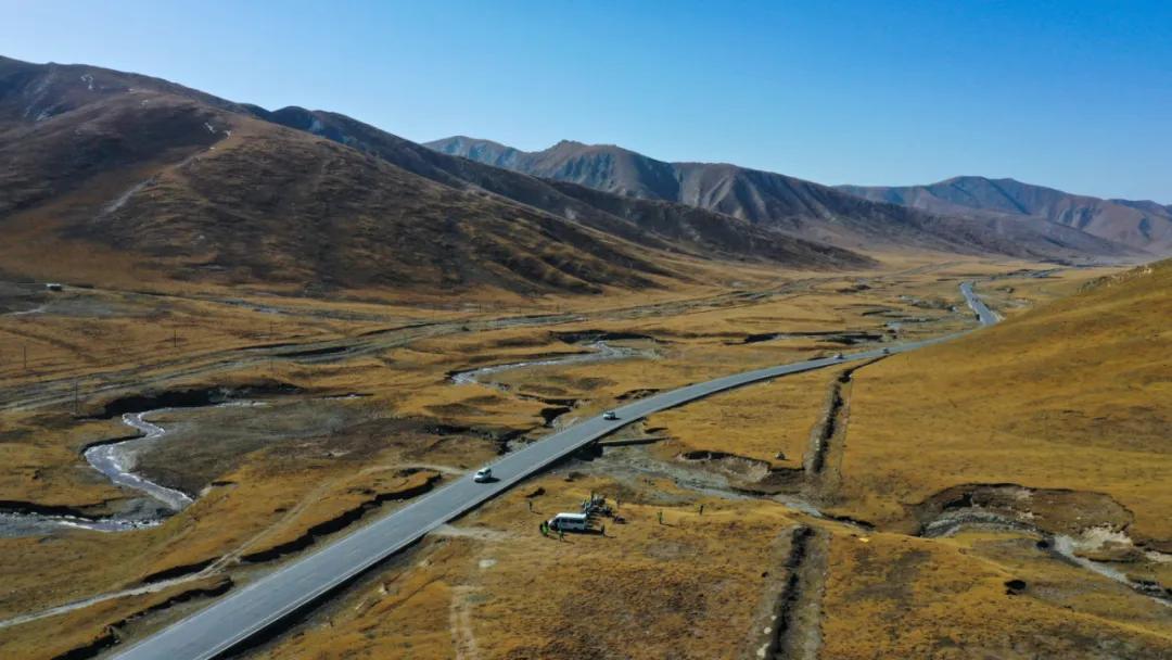 車隊(duì)從高速的一個(gè)交叉路口(沒(méi)錯(cuò)這里的高速不時(shí)與其他公路有交叉)來(lái)到一條單車道的瀝青、石子路,開始向托素湖行進(jìn)。