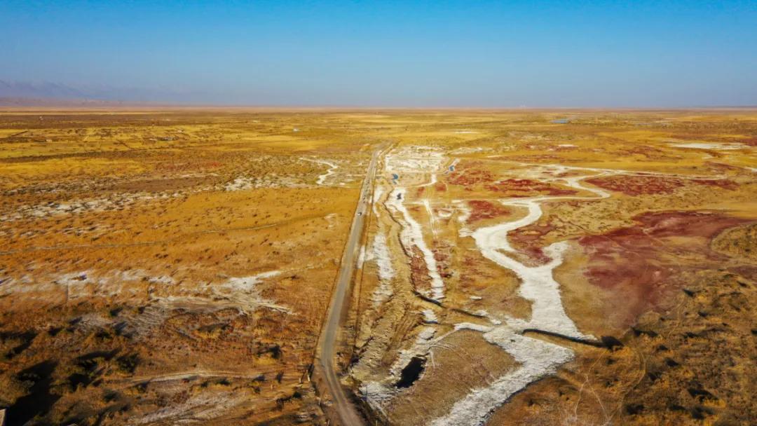 這一段路程大約有三四十公里,越靠近托素湖,感覺越荒涼,路況也越來(lái)越差,路面松散碎石越來(lái)越多,不時(shí)有坑洼出現(xiàn),一路上車隊(duì)不時(shí)揚(yáng)起濃濃的灰塵,四周全部是生長(zhǎng)在鹽堿地上灰黃的葦草,一眼望去,連綿不絕,與遠(yuǎn)處的山脈融為一體。只有到了這里,你才能看到什么是無(wú)人區(qū)的荒涼、枯寂、空曠,不自覺生出“天地悠悠、人生苦短”的感覺。