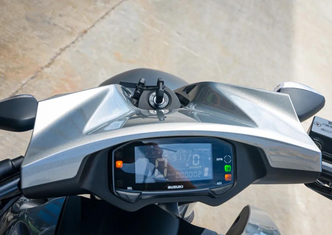 酷道155的車(chē)頭布局很獨(dú)特,電門(mén)鎖在儀表盤(pán)上部,儀表更接近車(chē)身和駕駛者,很多巡航車(chē)也都是這樣的做法,甚至還有將儀表直接放置在油箱上的,酷道上的這塊負(fù)顯液晶儀表,和極客颯是同款,還有一個(gè)可自定義轉(zhuǎn)速的換擋提示燈。