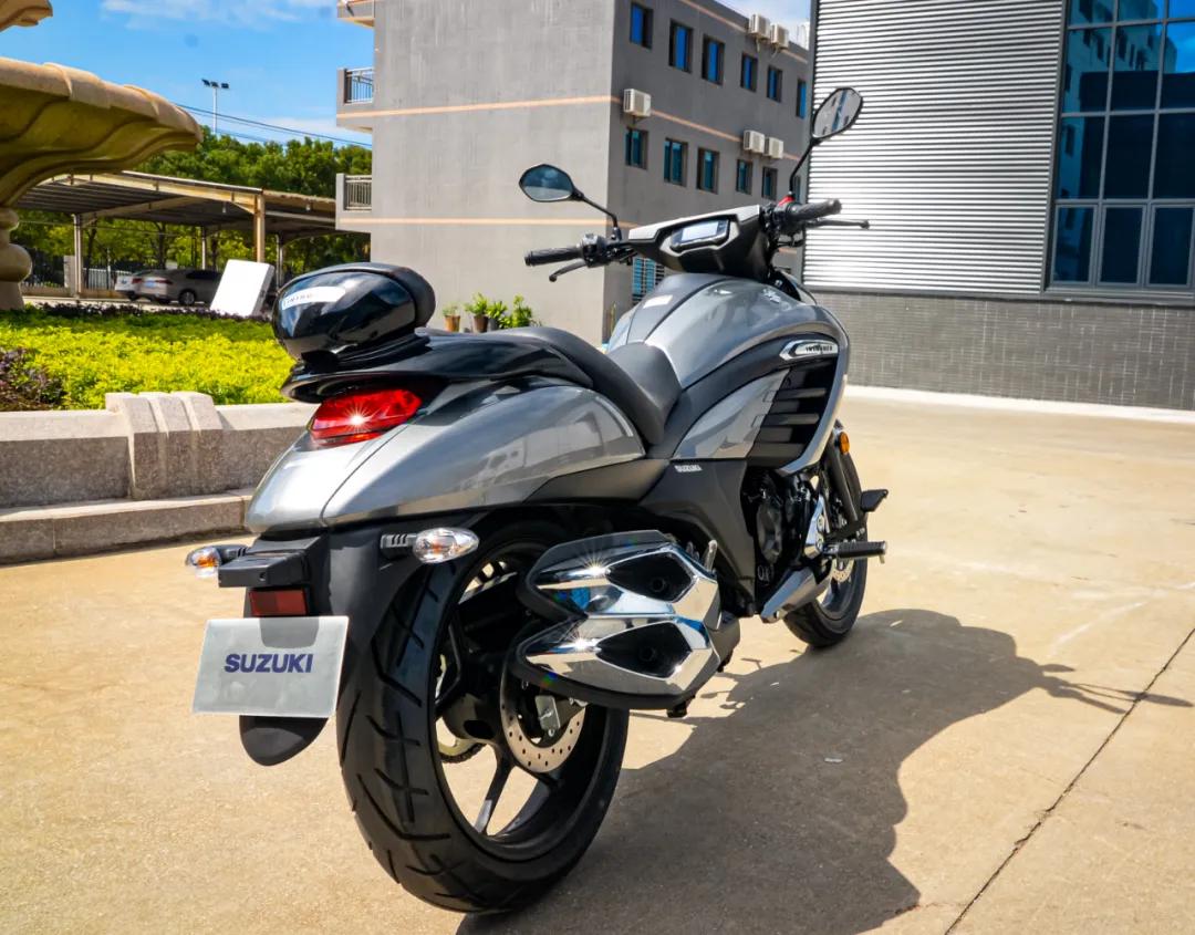 車(chē)子尾部的造型也比較流暢,鍍鉻的雙出排氣造型相當(dāng)夸張,后輪140胎寬對(duì)于155的排量來(lái)說(shuō),完全是越級(jí)別的配置,這兩個(gè)元素疊加起來(lái),盡顯Intruder入侵者的彪悍風(fēng)格。