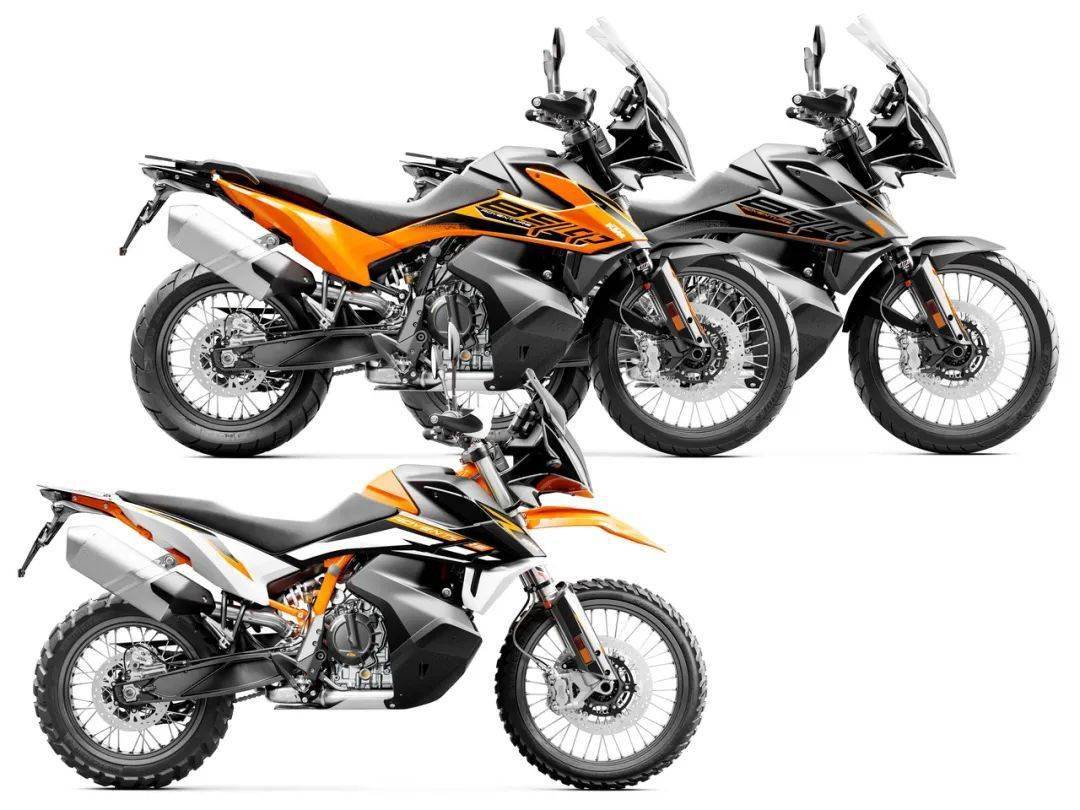 下面的圖片,KTM 890 探險(xiǎn)(890 Adventure)和 890 探險(xiǎn) R(890 Adventure R,橙色車架)。