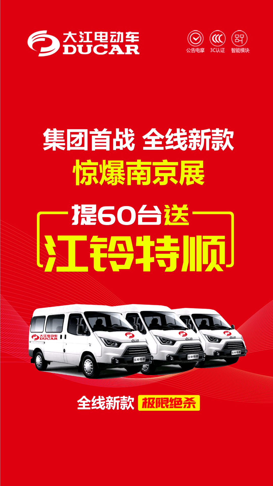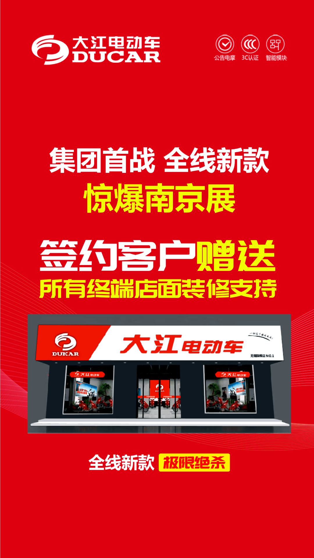 今年南京展,大江電動(dòng)車全權(quán)支持經(jīng)銷商,必將憑借高技術(shù)的車型、獨(dú)家的技術(shù)優(yōu)勢(shì)、豐厚的營(yíng)銷政策脫穎而出,成為最耀眼的明星品牌之一!