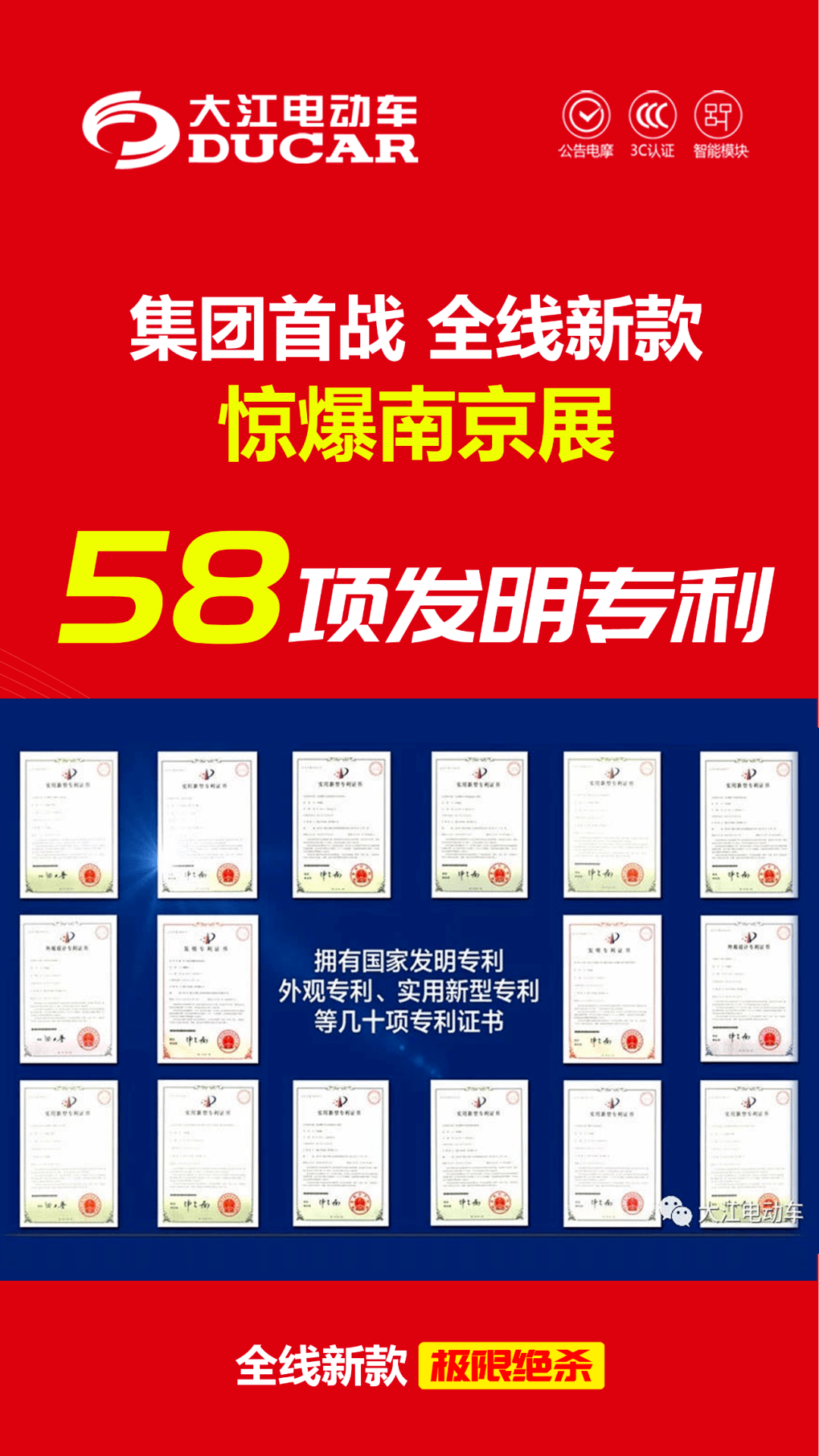 目前電動(dòng)車行業(yè)內(nèi),始終堅(jiān)持“原創(chuàng)技術(shù)”輸出的企業(yè)屈指可數(shù),但摩企出身的大江電動(dòng)車始終把“創(chuàng)新”作為公司持續(xù)發(fā)展的動(dòng)力。截止目前,公司已經(jīng)擁有58項(xiàng)發(fā)明專利,賦予大江電動(dòng)車更強(qiáng)實(shí)力!
