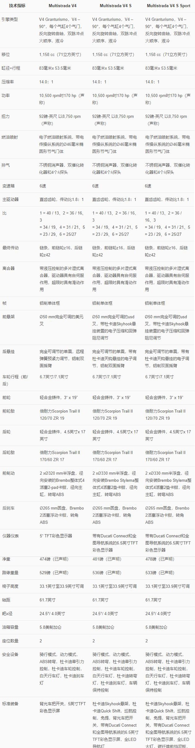 杜卡迪Multistrada V4的基本型號(hào)在歐洲售為18,990歐元(約14.75萬(wàn)RMB),Multistrada V4 S的售價(jià)為21,990歐元(約17.2萬(wàn)RMB),Multistrada V4 S Sport的售價(jià)為23,790歐元(約18.55萬(wàn)RMB)。