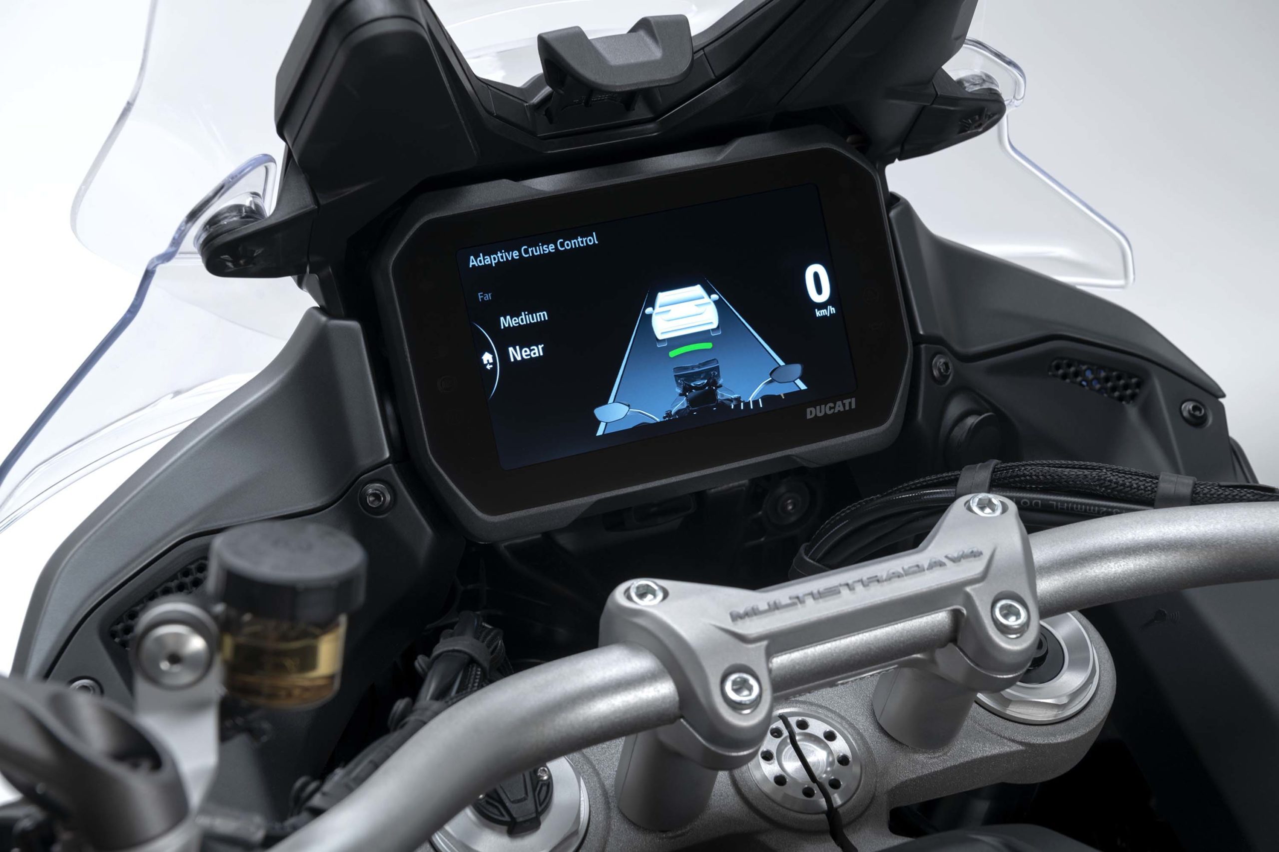 正如先前宣布的那樣,Multistrada V4是首款搭載前后主動(dòng)雷達(dá)的量產(chǎn)摩托車,由博世提供雷達(dá)單元,具有自適應(yīng)巡航控制和盲區(qū)檢測(cè)功能。自適應(yīng)巡航控制系統(tǒng)可以控制調(diào)節(jié)制動(dòng)器和油門,以保持與其他車輛相比的最小跟隨距離。盲區(qū)檢測(cè)系統(tǒng)激活后視鏡上的燈(與汽車的功能類似),以警告駕駛員從后方高速接近的車輛。但是,該技術(shù)在某些國(guó)家和地區(qū)尚未獲得使用認(rèn)證,車上雖然安裝有硬件,但軟件已停用。一旦獲得批準(zhǔn),經(jīng)銷商可以隨時(shí)激活該軟件。
