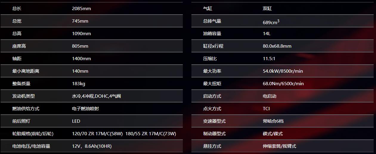 唯一值得一看的可能就是689cc的雙缸水冷發(fā)動(dòng)機(jī),最大功率54kW(73.5Ps)/8500rpm,最大扭矩68.0Nm/6500rpm,發(fā)動(dòng)機(jī)參數(shù)與貝納利752S相差無(wú)幾,但是價(jià)格翻了一倍。