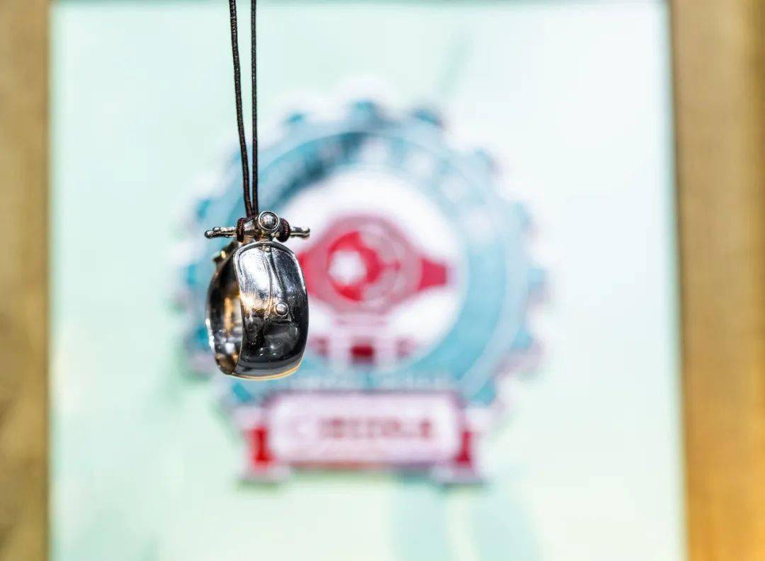 戒指為 925 純銀開口,表面作舊處理。內(nèi)圈有 Vespa 中國俱樂部的定制英文名稱??梢宰鳛榻渲复髟谑稚希部梢杂靡粋€皮繩子固定作為項鏈墜子。無論哪種方式,TA 都是一款特別別致和精致的物件。