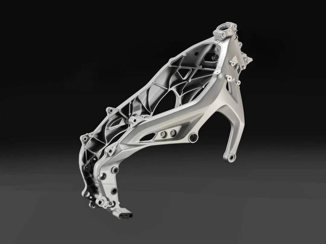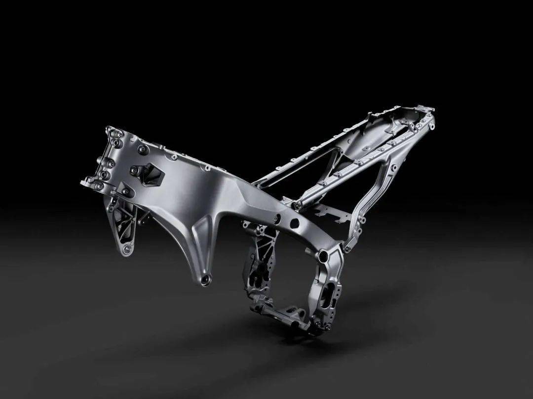 為了與更緊湊的車架和更短的前叉相匹配,車頭轉(zhuǎn)向軸的位置降低了 30 mm,此舉可在轉(zhuǎn)向時(shí)增加了前端抓地力的感覺、同時(shí)也提高了對(duì)騎士在駕駛時(shí)的反饋水平。新設(shè)計(jì)的、同樣以 CF 壓鑄技術(shù)制成的鋁制副車架/尾樑,比現(xiàn)行款的鋼結(jié)構(gòu)設(shè)計(jì)輕 1.5 公斤。