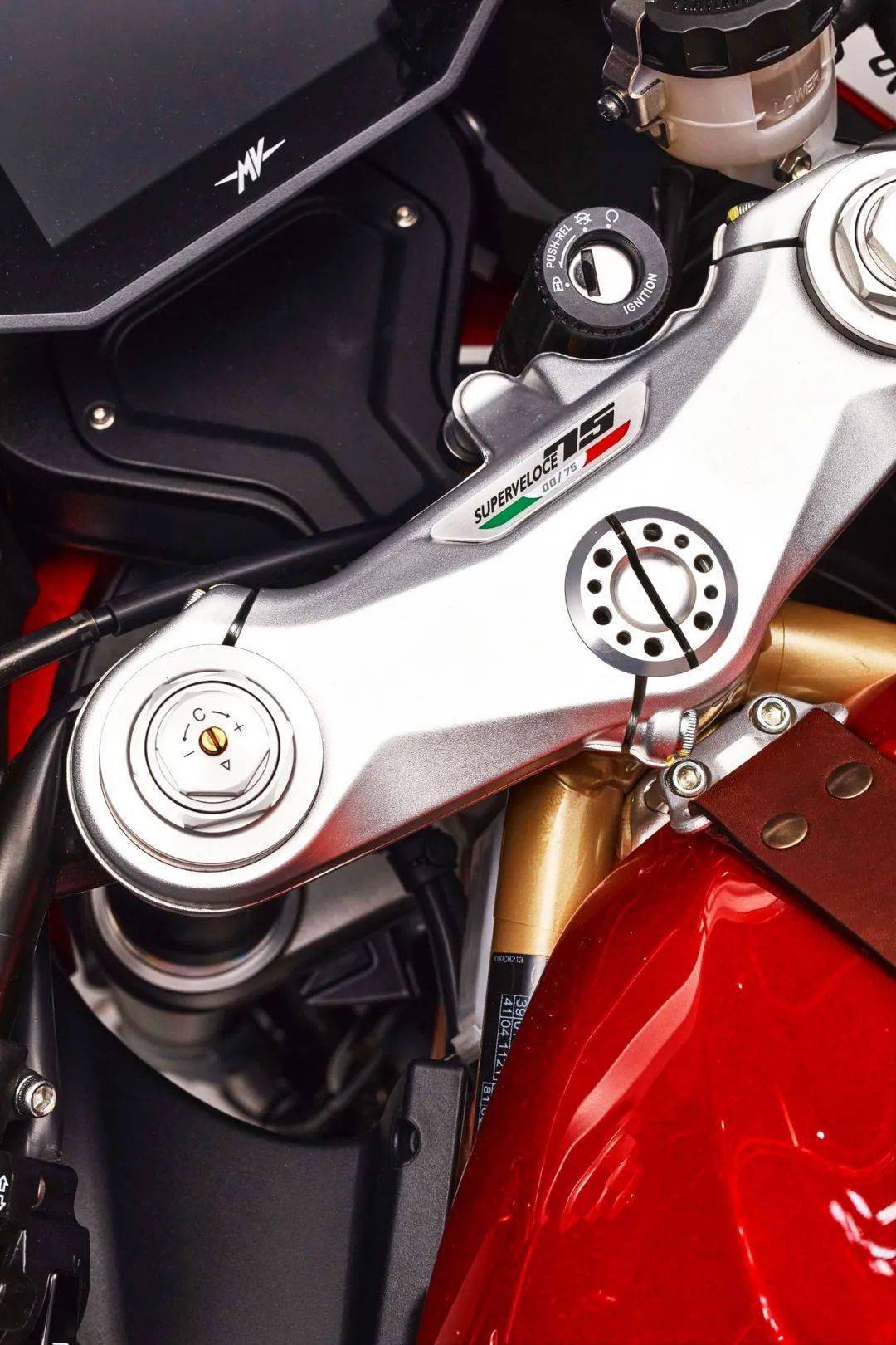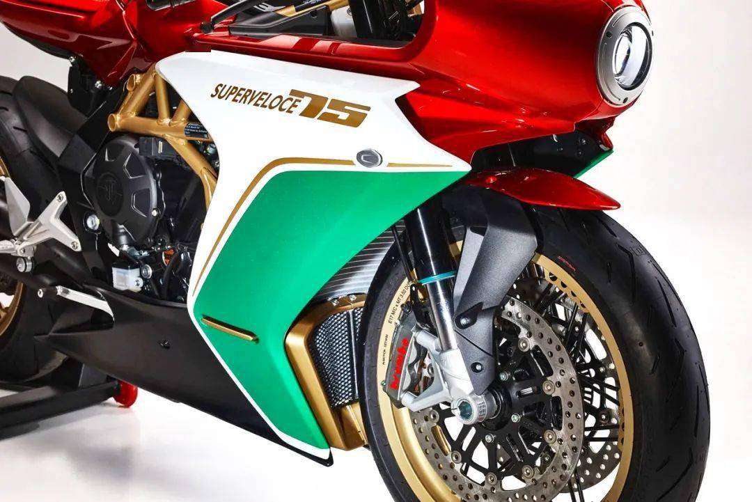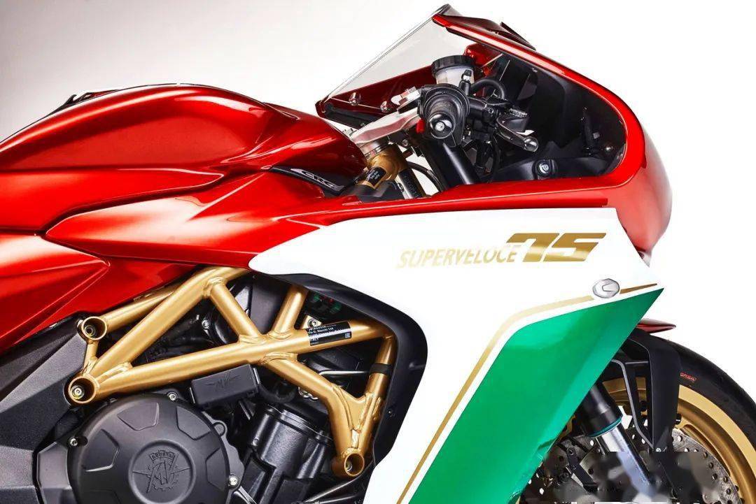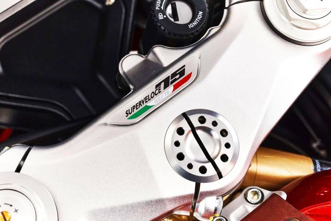 而 Superveloce 75 Anniversario 七十五周年限量版紀(jì)念車(chē)型,采用了一個(gè)意大利國(guó)旗印象的三色圖案,顯眼的紅色與金色相襯,標(biāo)配了 Arrow 的排汽系統(tǒng)、和對(duì)應(yīng)的 ECU 數(shù)據(jù)包,上三星(上前叉三角臺(tái))刻有一個(gè)特定的編號(hào),并附送證書(shū)。此外,還有部分出廠前的選裝件、供客戶(hù)在下單采購(gòu)時(shí)一并挑選。