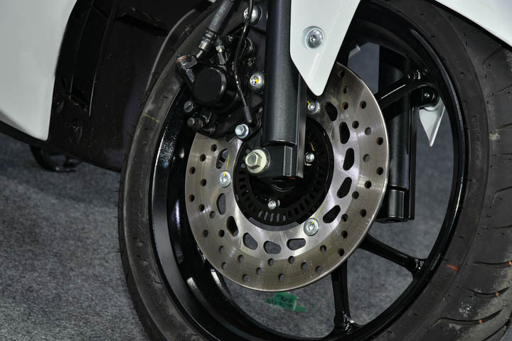 座椅高度僅765mm,可以說很低,但由于座椅較寬,對于身高嬌小的車手來說有些困難,車重僅有132kg,伸縮式前避震和后雙避震。前輪尺寸為110 / 70-13,后輪尺寸為130 / 70-13。前后制動均為盤式制動器,配備了雙通道ABS功能。