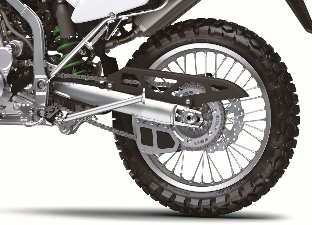 發(fā)動機底盤等方面都與KLX300相同,包括剎車規(guī)格,不同的是KLX300SM配有17英寸前后輪,雖然同為鋼絲條幅輪圈,但是輪胎是更適合鋪裝路面的運動輪胎。