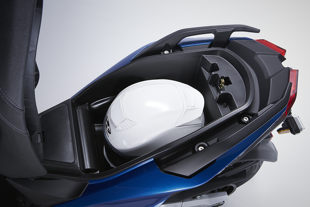 雖然后避震的形式,會影響座桶空間,但是好在深度足夠,放置一頂全盔沒有問題。